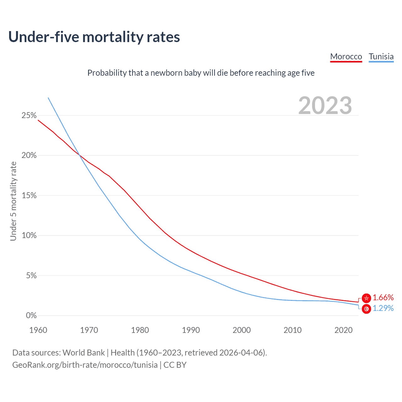 The chance that a newborn baby will die before reaching age five is 1.66% in Morocco and 1.29% in Tunisia. Above is a chart with historical data on under-five mortality rates.