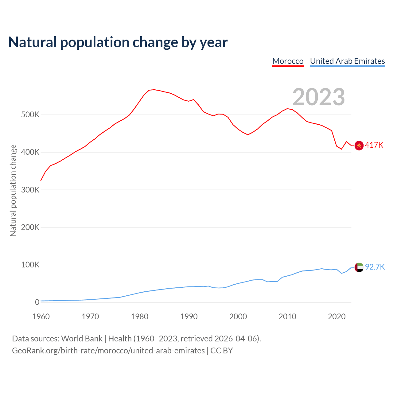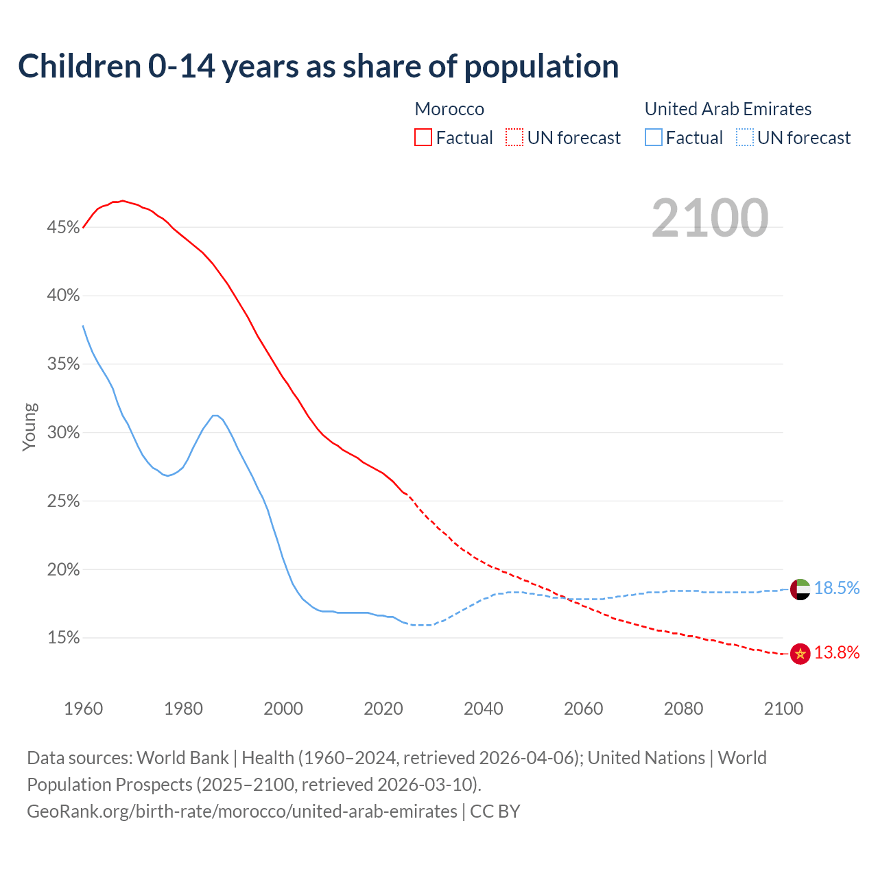 Morocco has an annual birth rate of 16.7 births per 1,000 people, compared to 9.77 for the United Arab Emirates. The average number of children a woman is expected to have during her lifetime — the fertility rate, is 2.23 in Morocco and 1.2 in the United Arab Emirates — 46.2% difference.