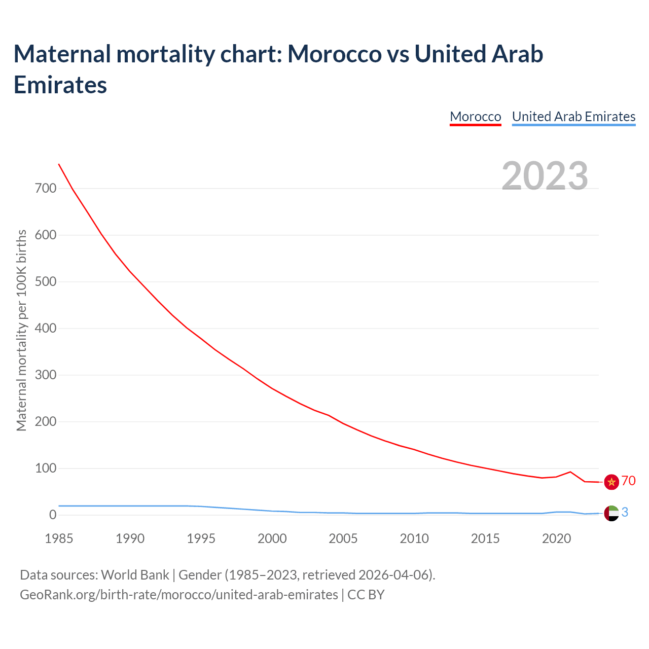 The maternal mortality rate, which is the probability of dying during childbirth or within 42 days of pregnancy termination, is 70 deaths per 100,000 live births in Morocco, compared to 3 deaths in the United Arab Emirates.