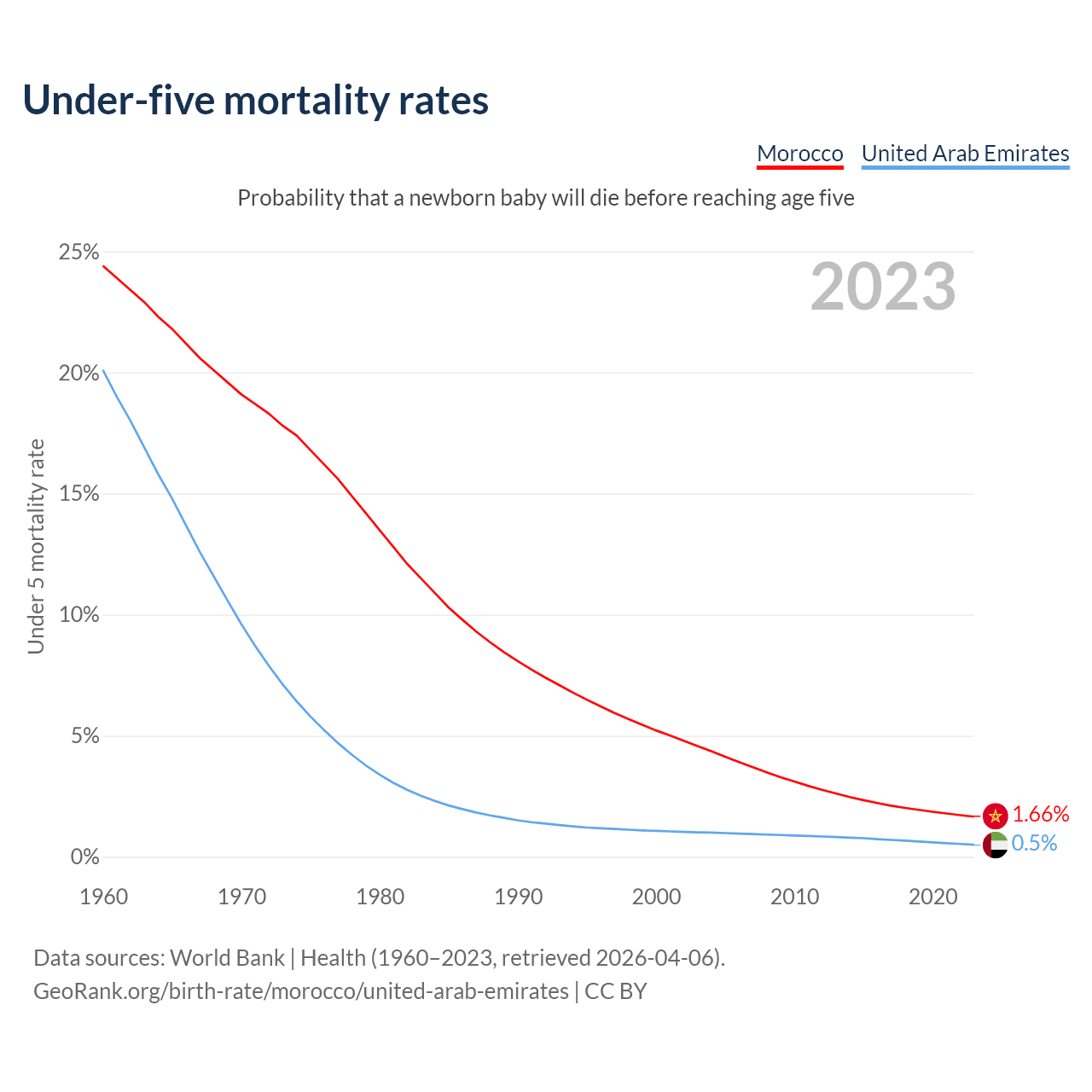 The chance that a newborn baby will die before reaching age five is 1.66% in Morocco and 0.5% in the United Arab Emirates. Above is a chart with historical data on under-five mortality rates.