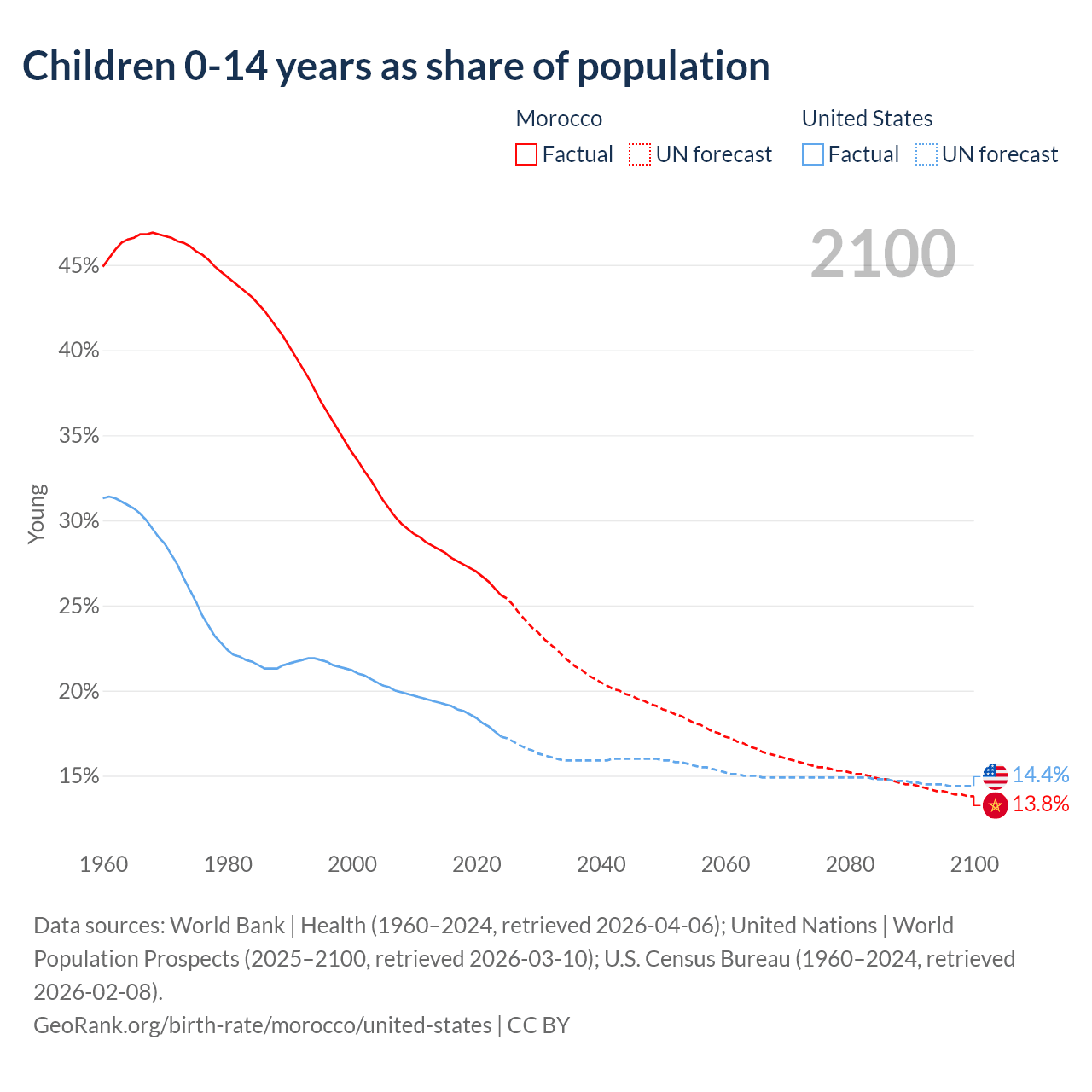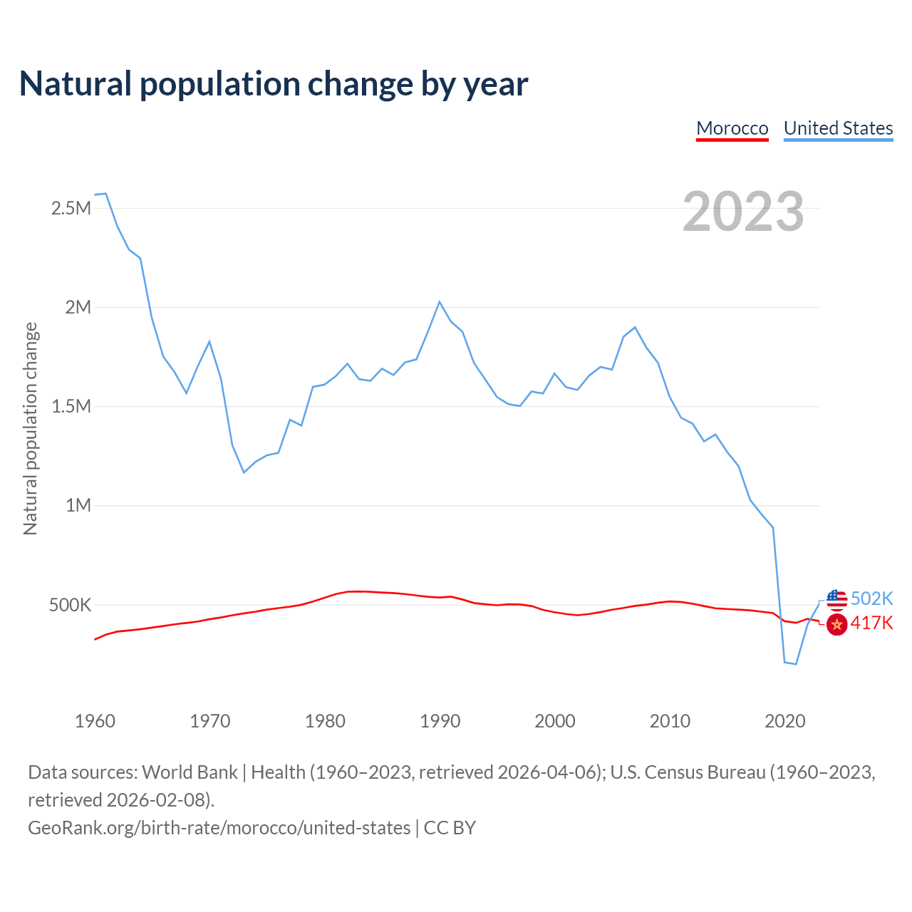 According to the latest available data on birth rates, the fertility rate in Morocco was 2.23 children per woman in 2023, compared to 1.62 in the United States in 2023. The replacement level is considered to be 2.1 children per woman.