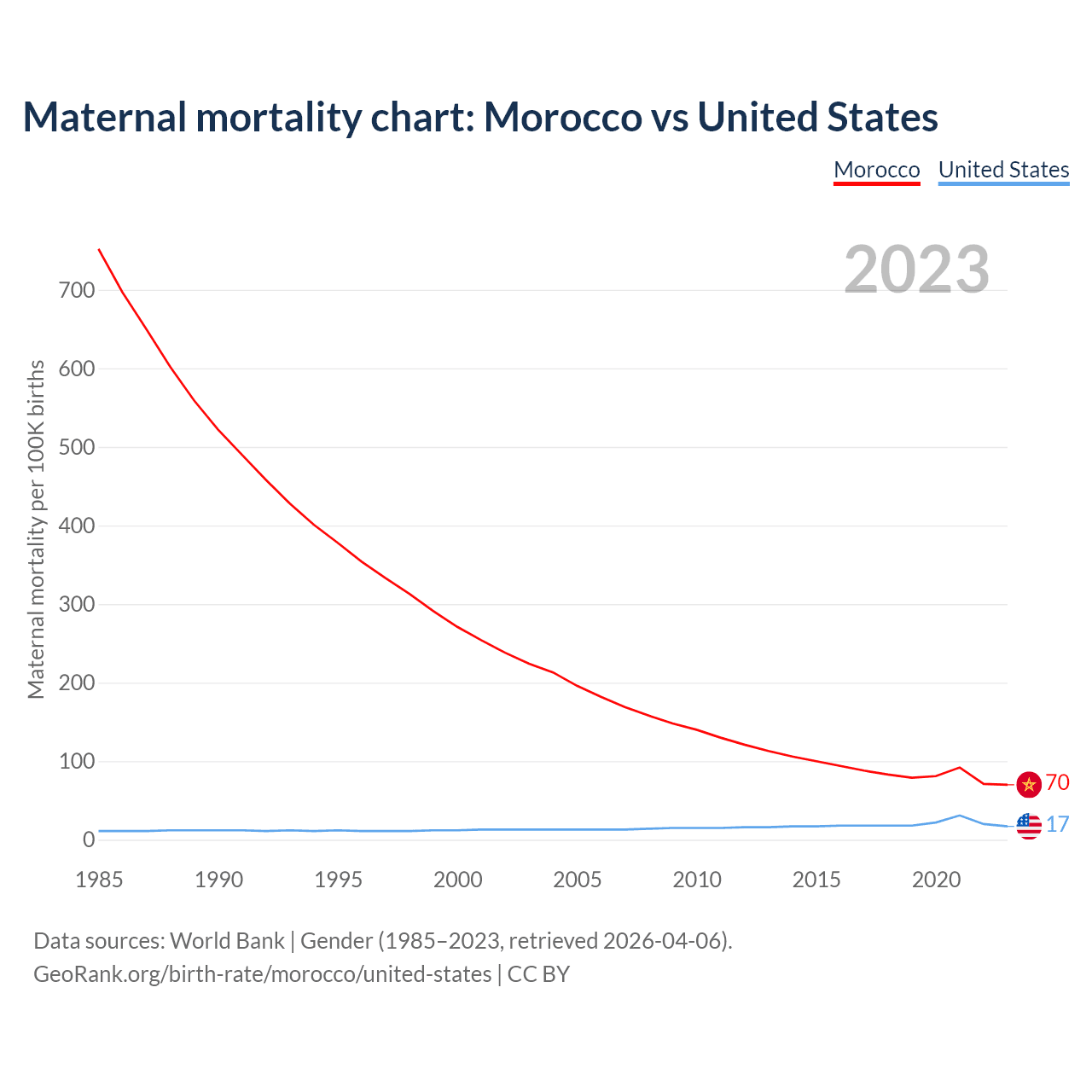 The maternal mortality rate, which is the probability of dying during childbirth or within 42 days of pregnancy termination, is 70 deaths per 100,000 live births in Morocco, compared to 17 deaths in the United States.