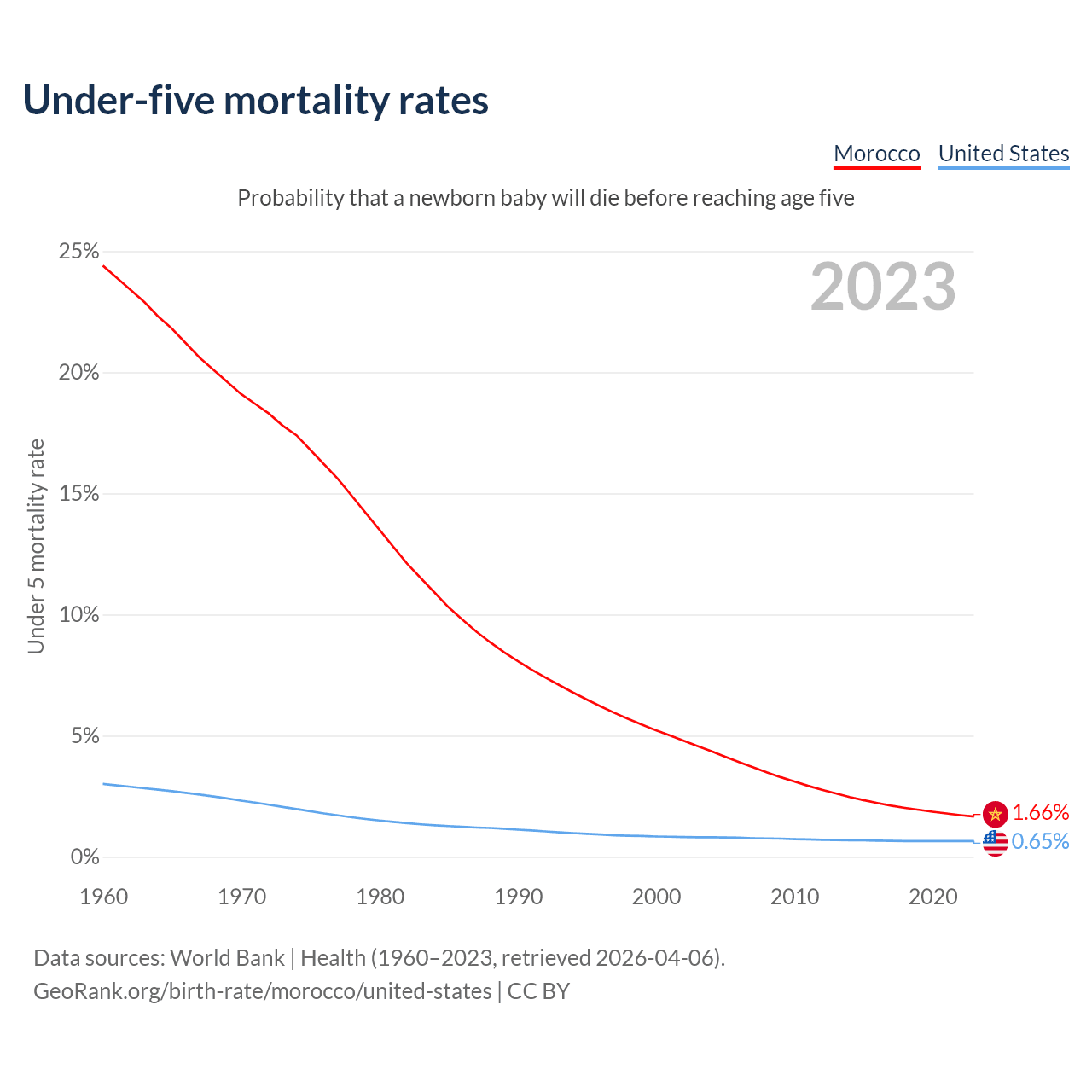 The chance that a newborn baby will die before reaching age five is 1.66% in Morocco and 0.65% in the United States. Above is a chart with historical data on under-five mortality rates.