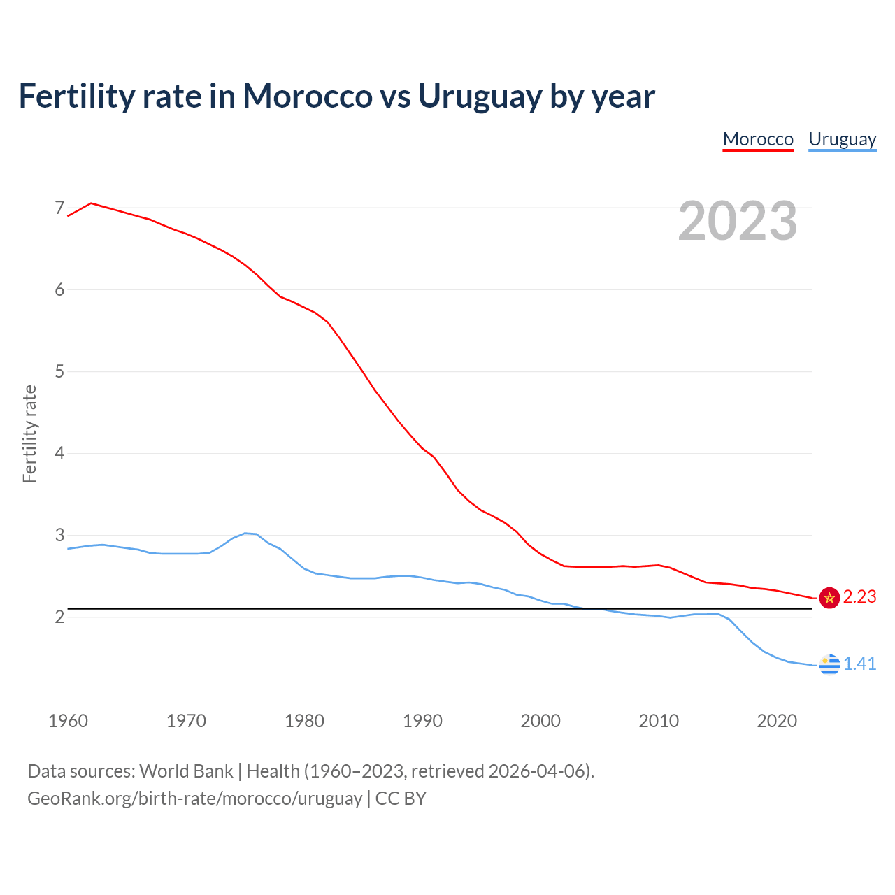 1960 vs 2023, the fertility rate has decreased by 67.6% in Morocco and by 50.2% in Uruguay — in 1960, it was 6.89 and 2.83, respectively.