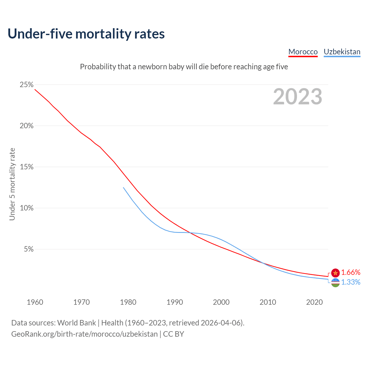 The chance that a newborn baby will die before reaching age five is 1.66% in Morocco and 1.33% in Uzbekistan. Above is a chart with historical data on under-five mortality rates.