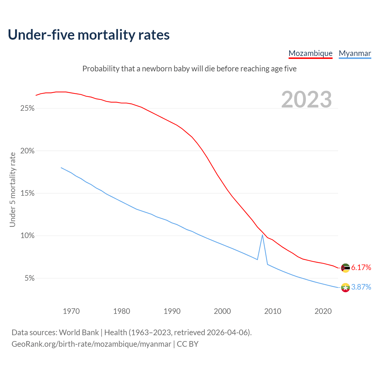 The chance that a newborn baby will die before reaching age five is 6.17% in Mozambique and 3.87% in Myanmar. Above is a chart with historical data on under-five mortality rates.