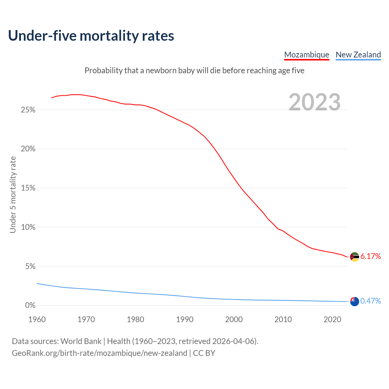 The chance that a newborn baby will die before reaching age five is 6.17% in Mozambique and 0.47% in New Zealand. Above is a chart with historical data on under-five mortality rates.