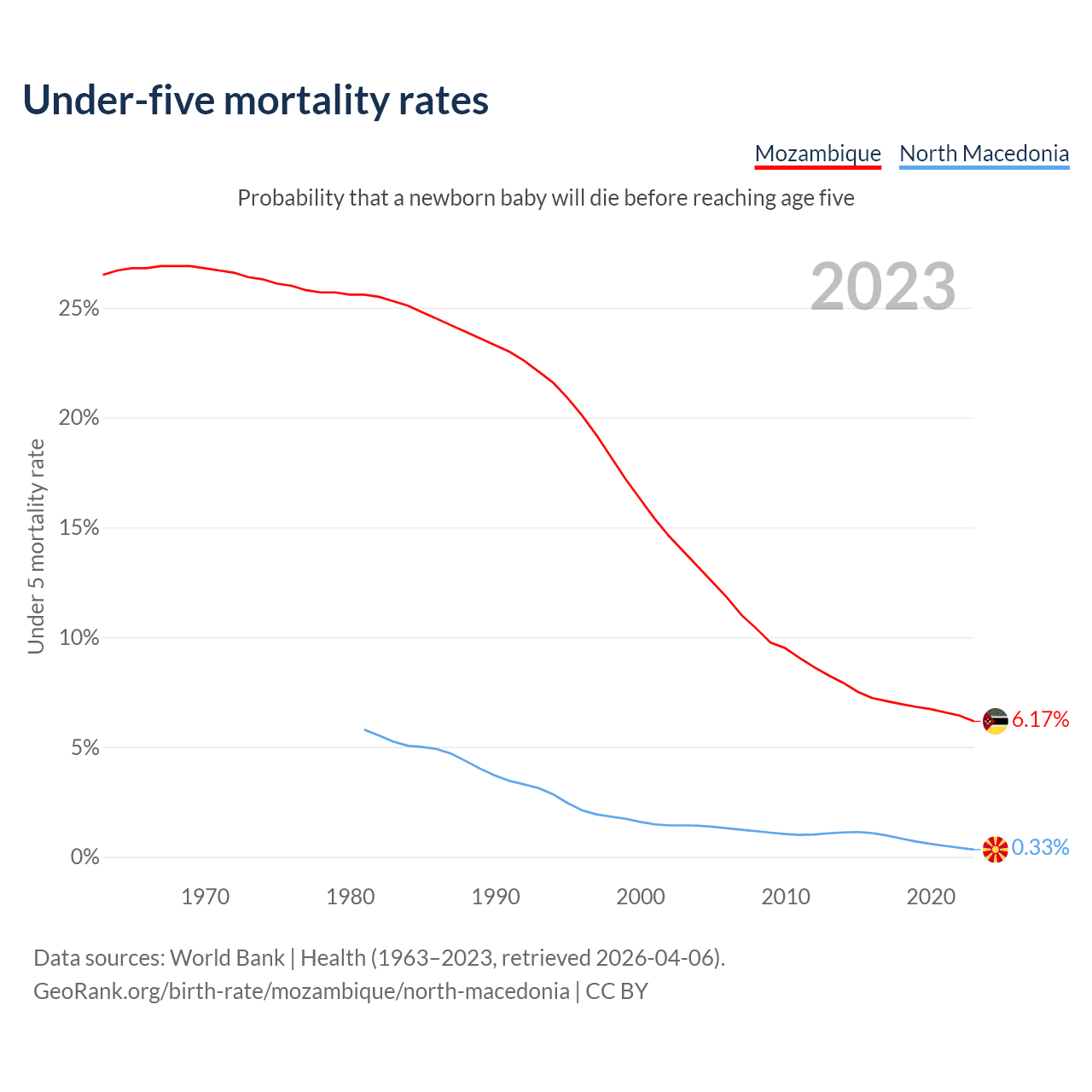 The chance that a newborn baby will die before reaching age five is 6.17% in Mozambique and 0.33% in North Macedonia. Above is a chart with historical data on under-five mortality rates.