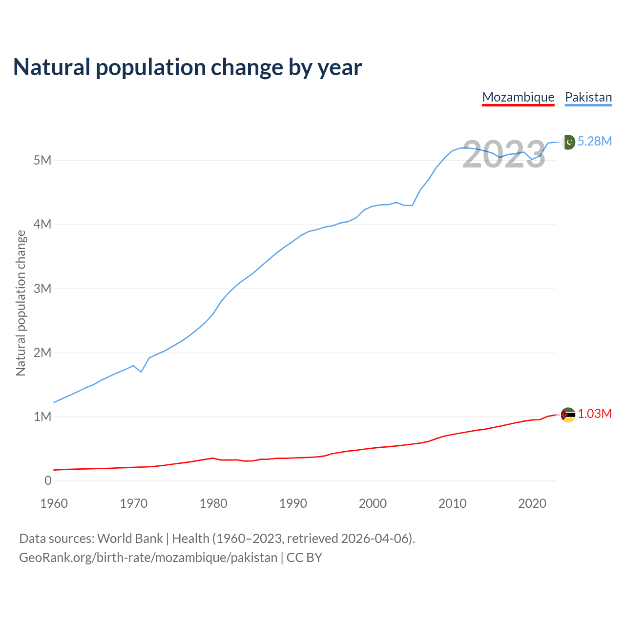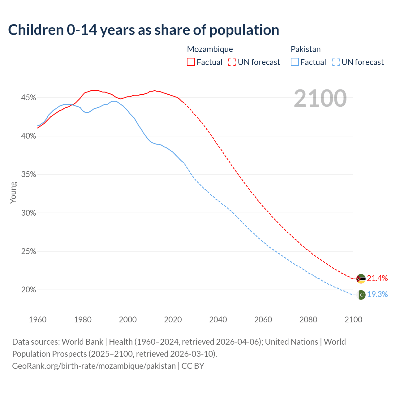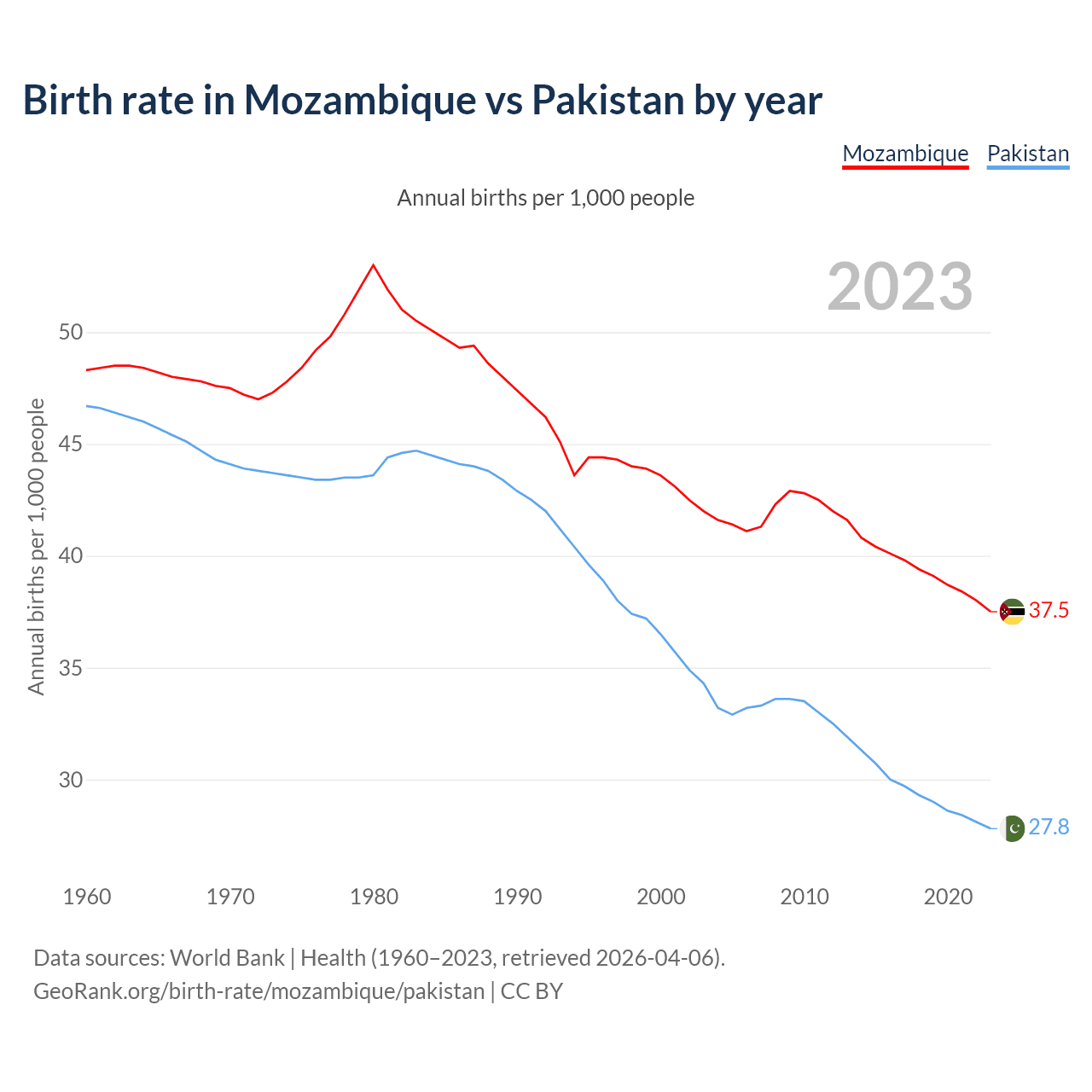 Mozambique has an annual birth rate of 37.5 births per 1,000 people, compared to 27.8 for Pakistan. The average number of children a woman is expected to have during her lifetime — the fertility rate, is 4.76 in Mozambique and 3.61 in Pakistan — 24.3% difference.