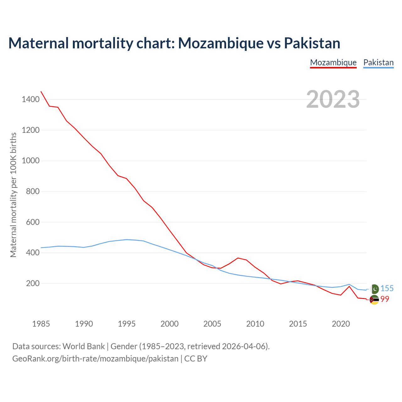 - Annual births per 1,000 women ages 15-19 (adolescent birth rate or teenage mother rate) is 153.5 in Mozambique vs 41.1 in Pakistan.