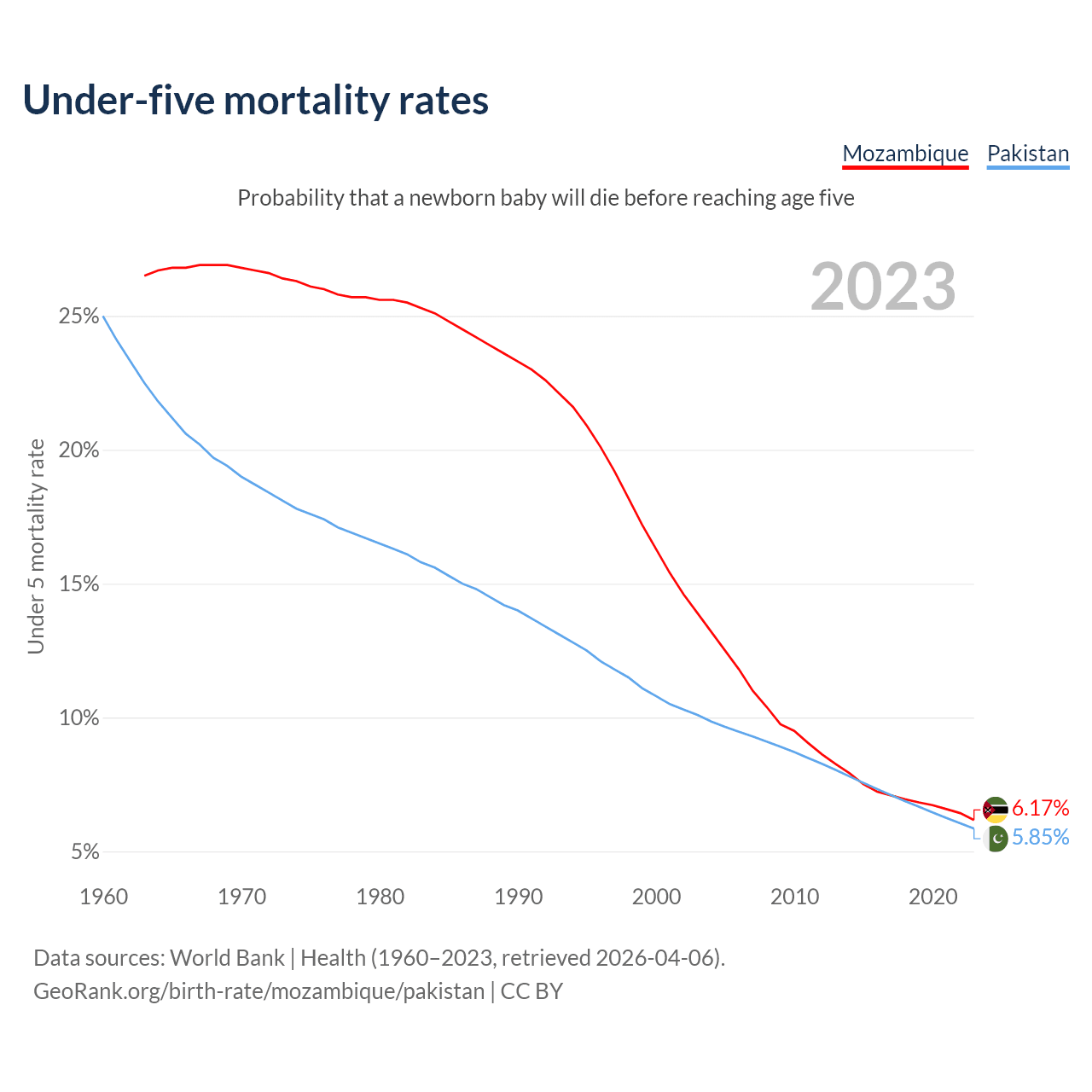 The chance that a newborn baby will die before reaching age five is 6.17% in Mozambique and 5.85% in Pakistan. Above is a chart with historical data on under-five mortality rates.