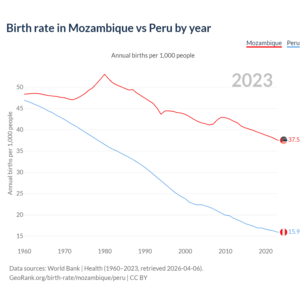 Mozambique has an annual birth rate of 37.5 births per 1,000 people, compared to 15.9 for Peru. The average number of children a woman is expected to have during her lifetime — the fertility rate, is 4.76 in Mozambique and 1.98 in Peru — 58.4% difference.