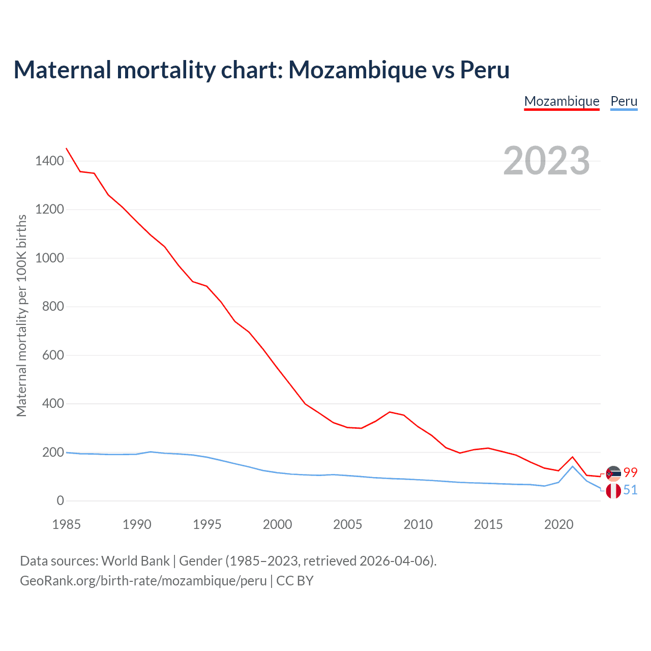 The maternal mortality rate, which is the probability of dying during childbirth or within 42 days of pregnancy termination, is 99 deaths per 100,000 live births in Mozambique, compared to 51 deaths in Peru.