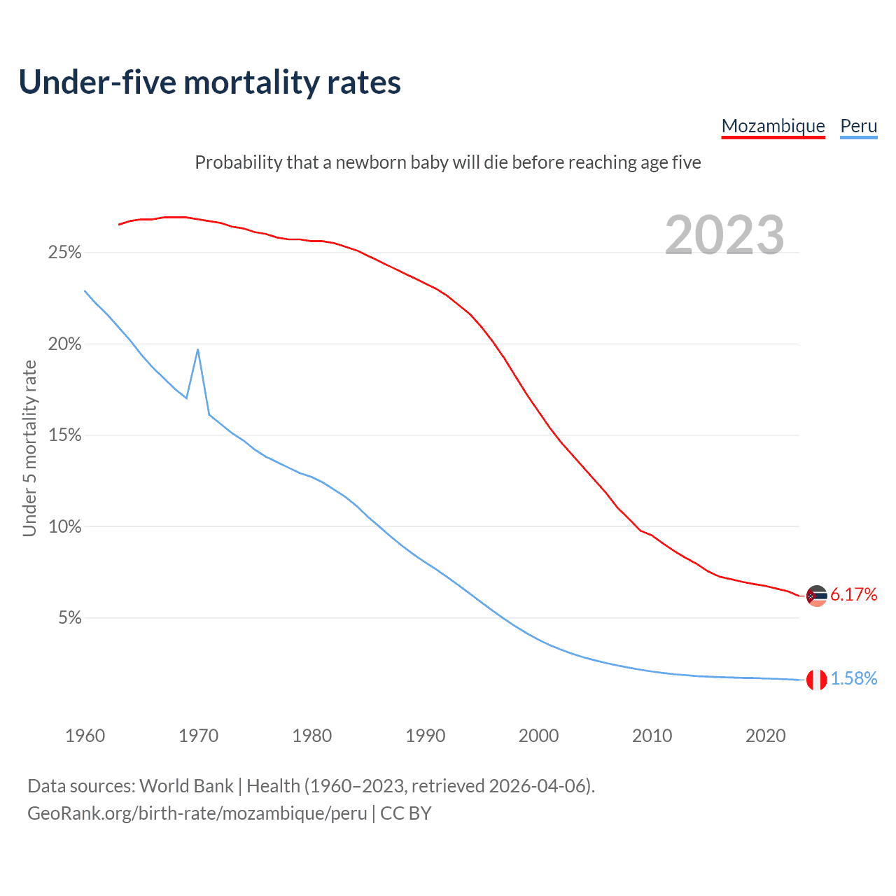 The chance that a newborn baby will die before reaching age five is 6.17% in Mozambique and 1.58% in Peru. Above is a chart with historical data on under-five mortality rates.