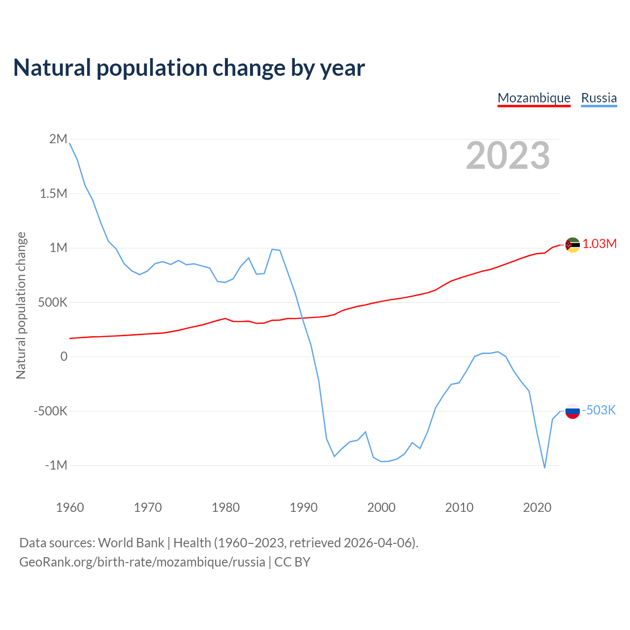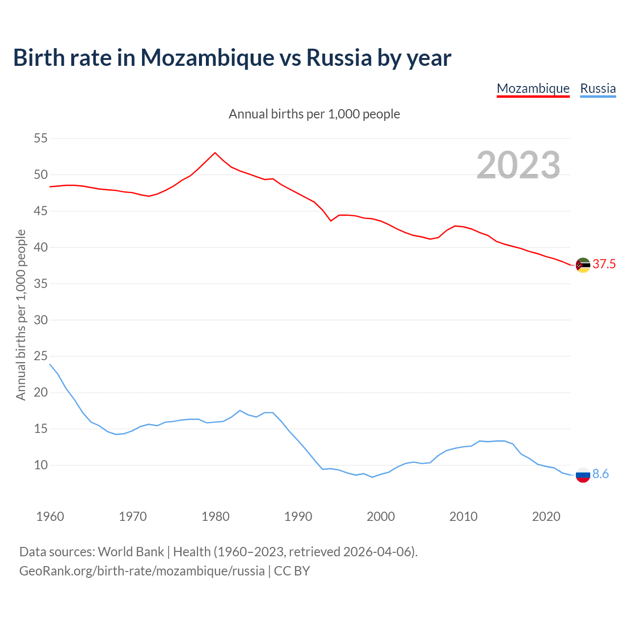 Mozambique has an annual birth rate of 37.5 births per 1,000 people, compared to 8.6 for Russia. The average number of children a woman is expected to have during her lifetime — the fertility rate, is 4.76 in Mozambique and 1.41 in Russia — 70.4% difference.