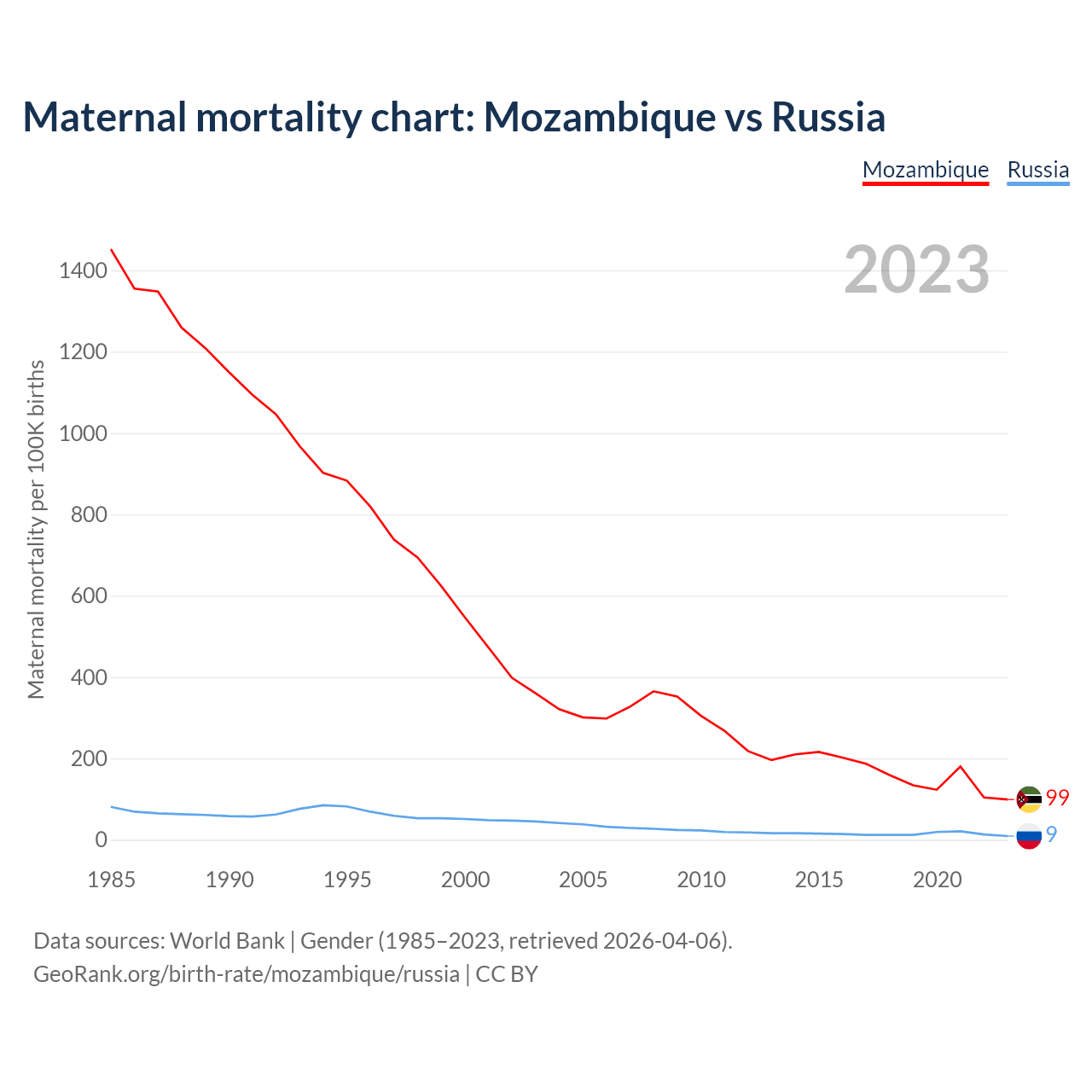 The maternal mortality rate, which is the probability of dying during childbirth or within 42 days of pregnancy termination, is 99 deaths per 100,000 live births in Mozambique, compared to 9 deaths in Russia.