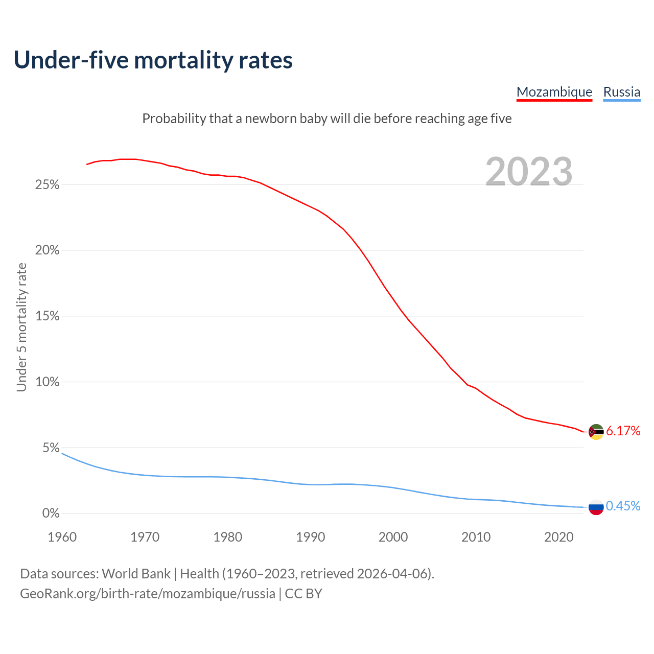 The chance that a newborn baby will die before reaching age five is 6.17% in Mozambique and 0.45% in Russia. Above is a chart with historical data on under-five mortality rates.