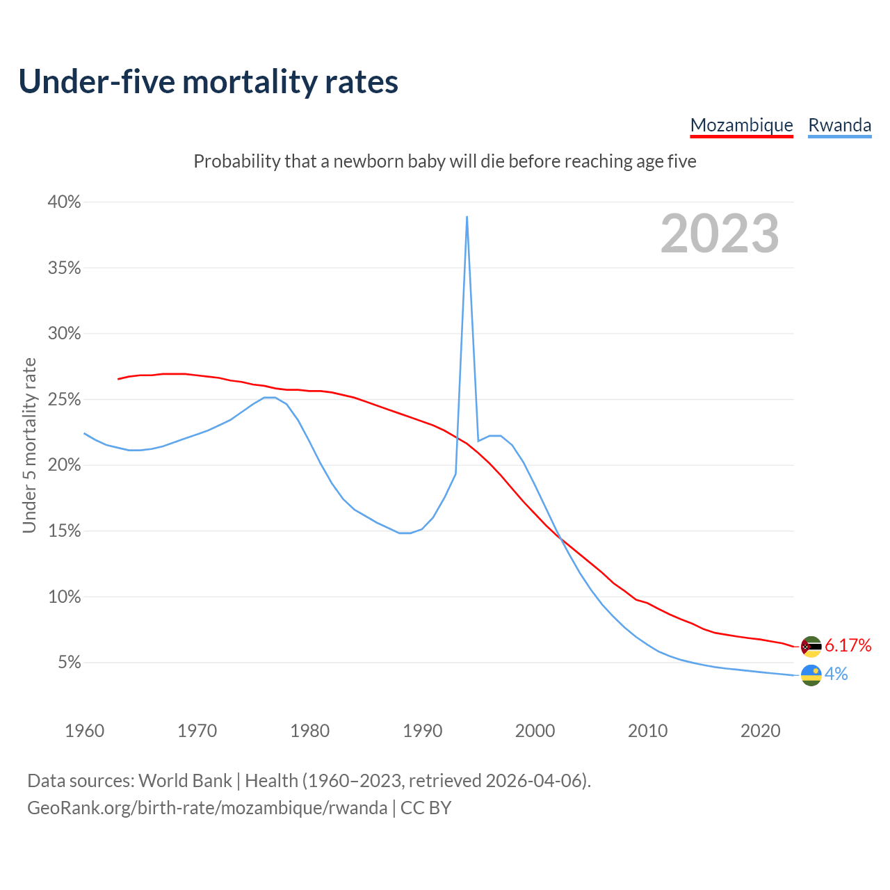 The chance that a newborn baby will die before reaching age five is 6.17% in Mozambique and 4% in Rwanda. Above is a chart with historical data on under-five mortality rates.