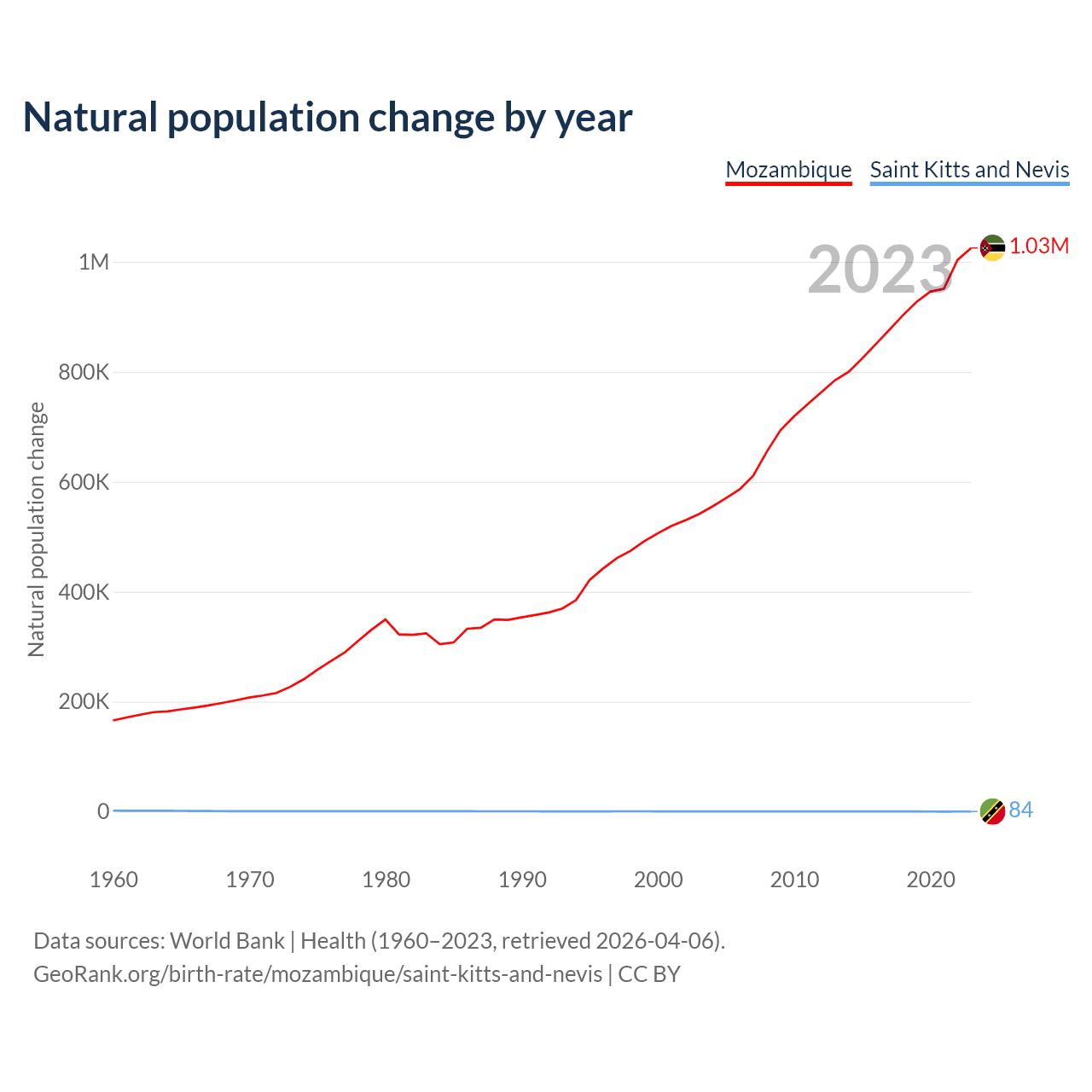 Check Mozambique vs Saint Kitts and Nevis population clock for a dynamic visualization of the changing population.