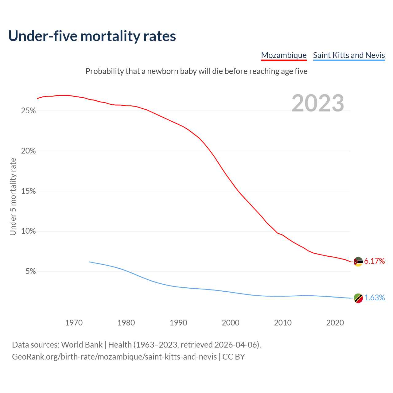The chance that a newborn baby will die before reaching age five is 6.17% in Mozambique and 1.63% in Saint Kitts and Nevis. Above is a chart with historical data on under-five mortality rates.