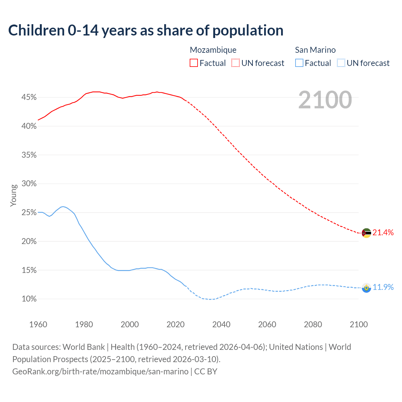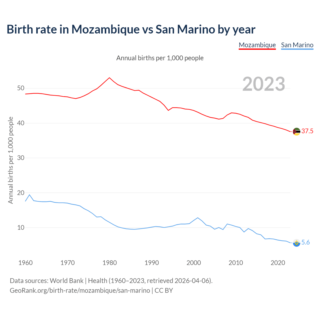 Mozambique has an annual birth rate of 37.5 births per 1,000 people, compared to 5.6 for San Marino. The average number of children a woman is expected to have during her lifetime — the fertility rate, is 4.76 in Mozambique and 1.15 in San Marino — 75.9% difference.