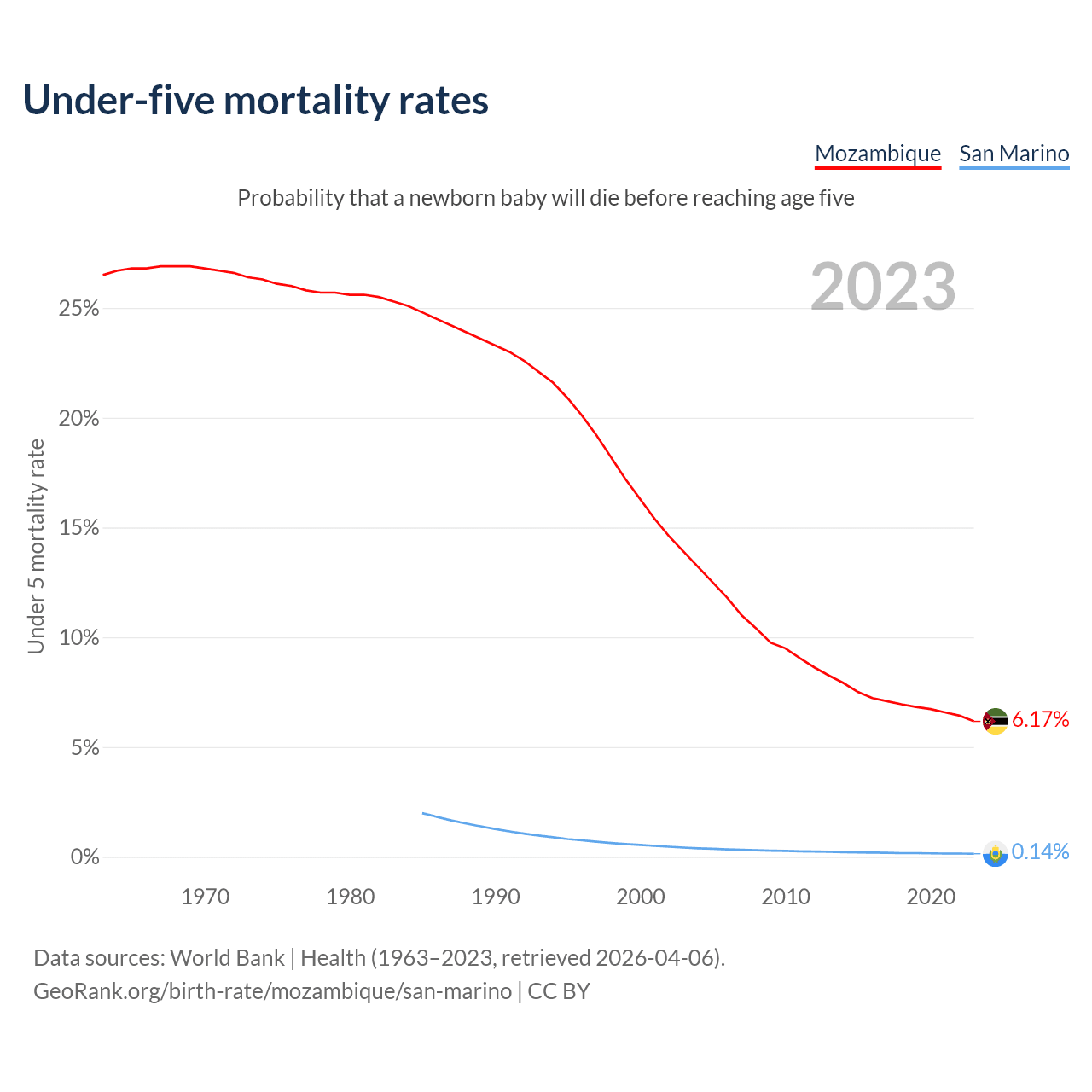 The chance that a newborn baby will die before reaching age five is 6.17% in Mozambique and 0.14% in San Marino. Above is a chart with historical data on under-five mortality rates.