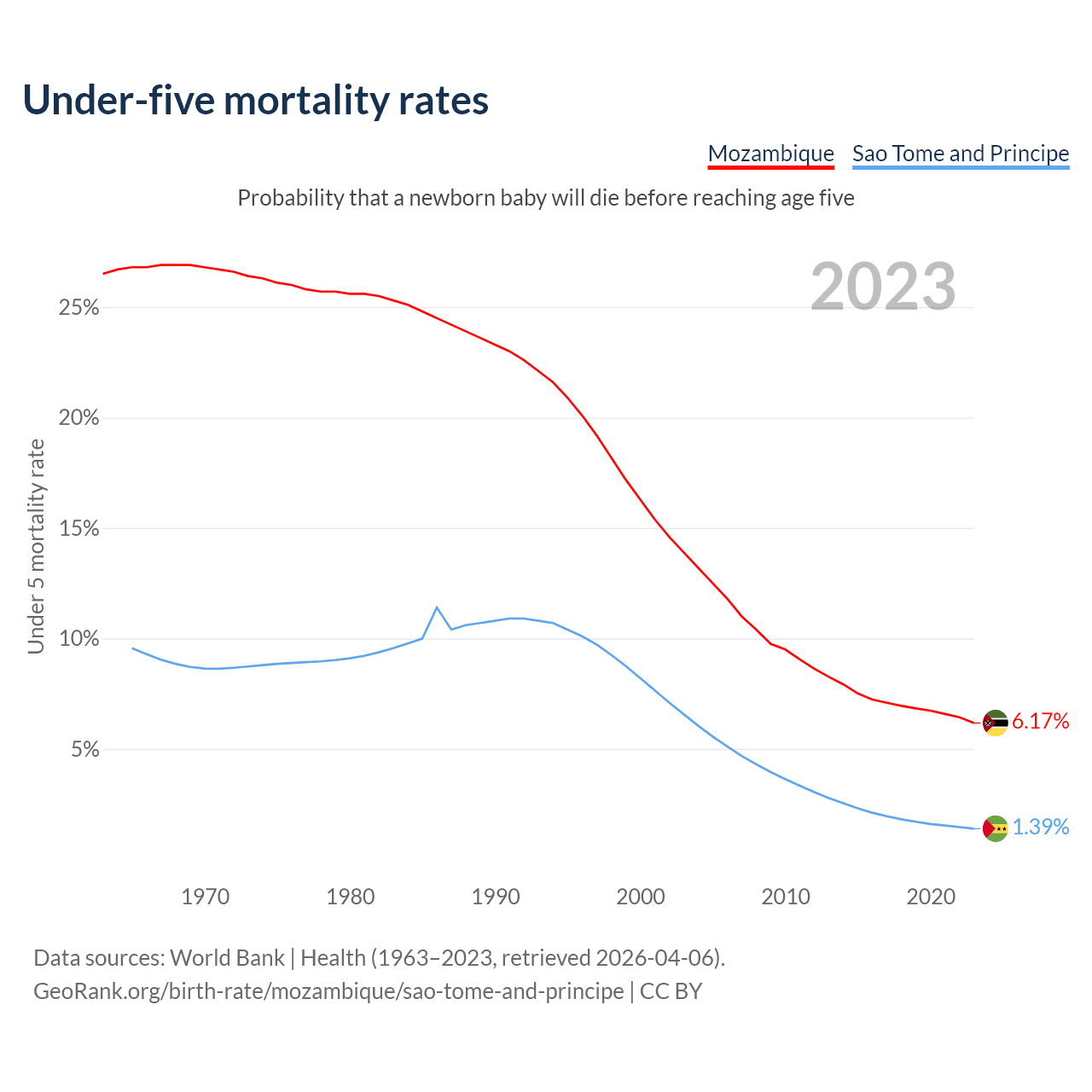 The chance that a newborn baby will die before reaching age five is 6.17% in Mozambique and 1.39% in Sao Tome and Principe. Above is a chart with historical data on under-five mortality rates.