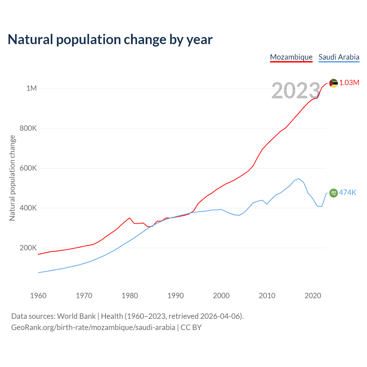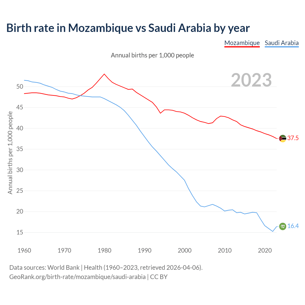 Mozambique has an annual birth rate of 37.5 births per 1,000 people, compared to 16.4 for Saudi Arabia. The average number of children a woman is expected to have during her lifetime — the fertility rate, is 4.76 in Mozambique and 2.28 in Saudi Arabia — 52.1% difference.