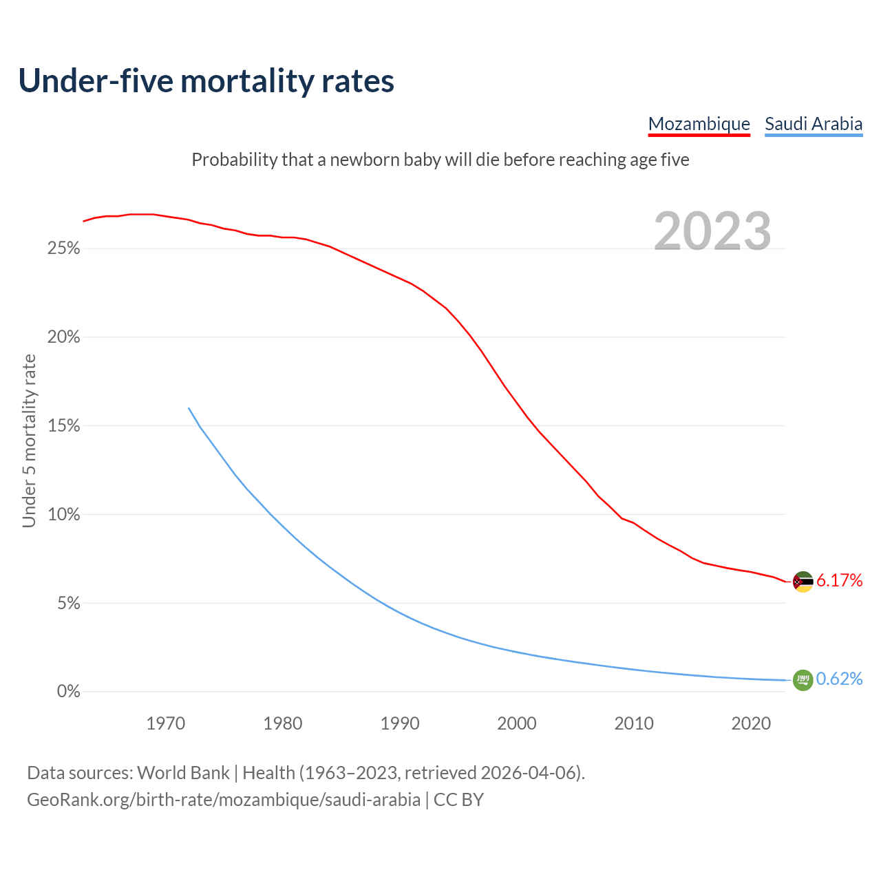 The chance that a newborn baby will die before reaching age five is 6.17% in Mozambique and 0.62% in Saudi Arabia. Above is a chart with historical data on under-five mortality rates.