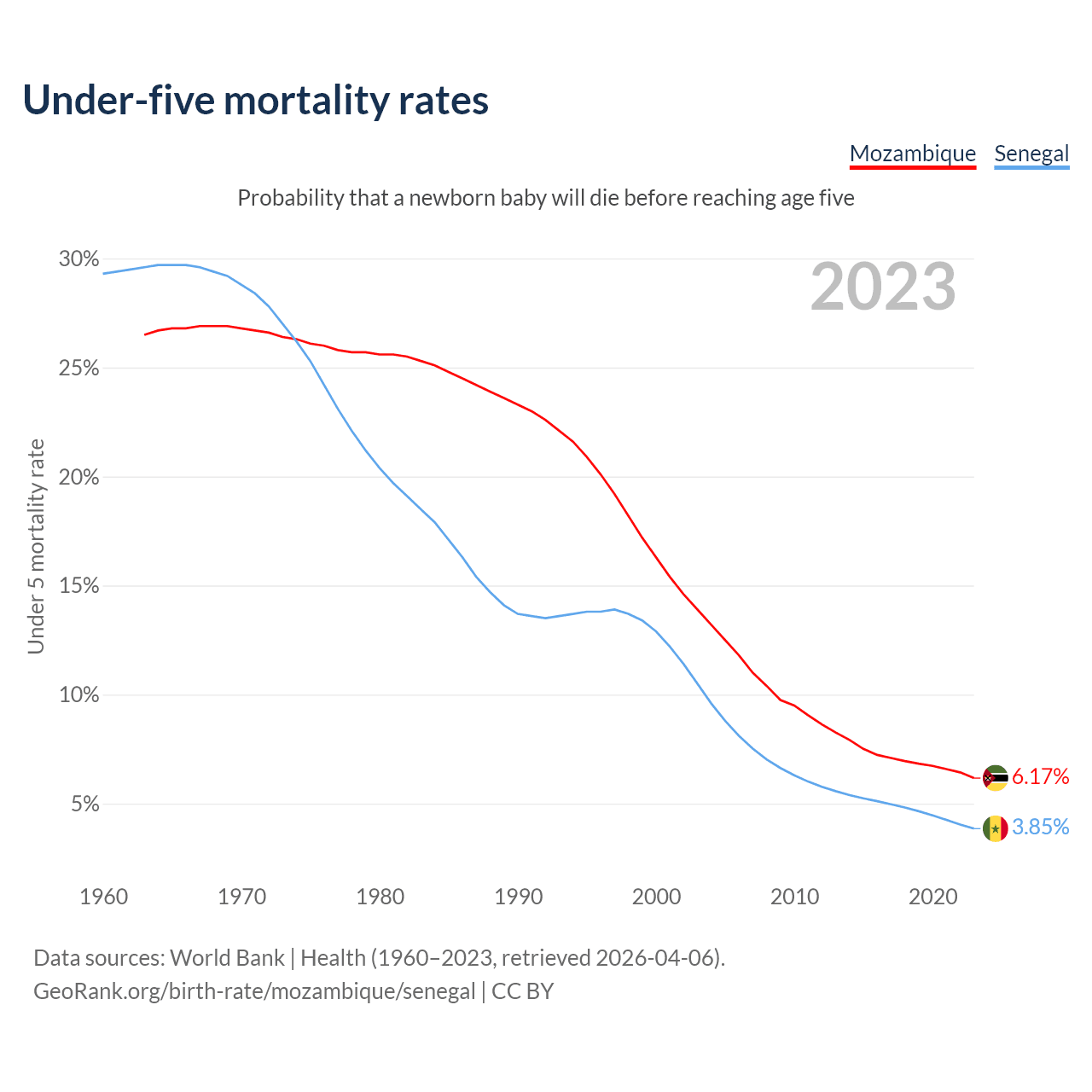 The chance that a newborn baby will die before reaching age five is 6.17% in Mozambique and 3.85% in Senegal. Above is a chart with historical data on under-five mortality rates.