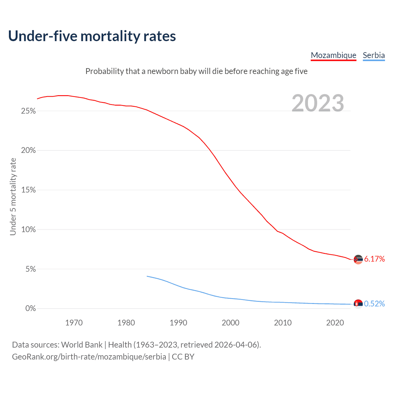 The chance that a newborn baby will die before reaching age five is 6.17% in Mozambique and 0.52% in Serbia. Above is a chart with historical data on under-five mortality rates.