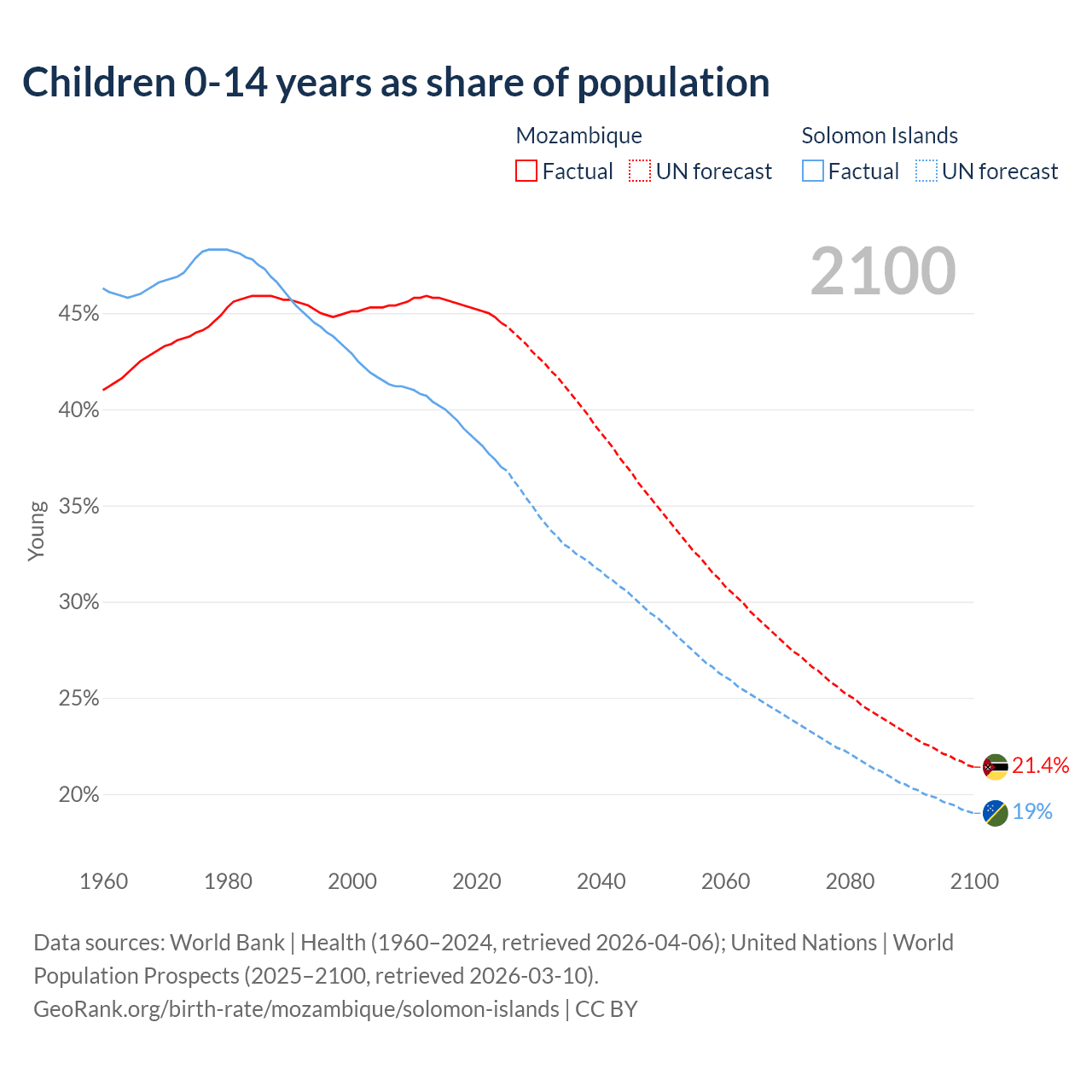 According to the latest available data on birth rates, the fertility rate in Mozambique was 4.76 children per woman in 2023, compared to 3.56 in the Solomon Islands in 2023. The replacement level is considered to be 2.1 children per woman.