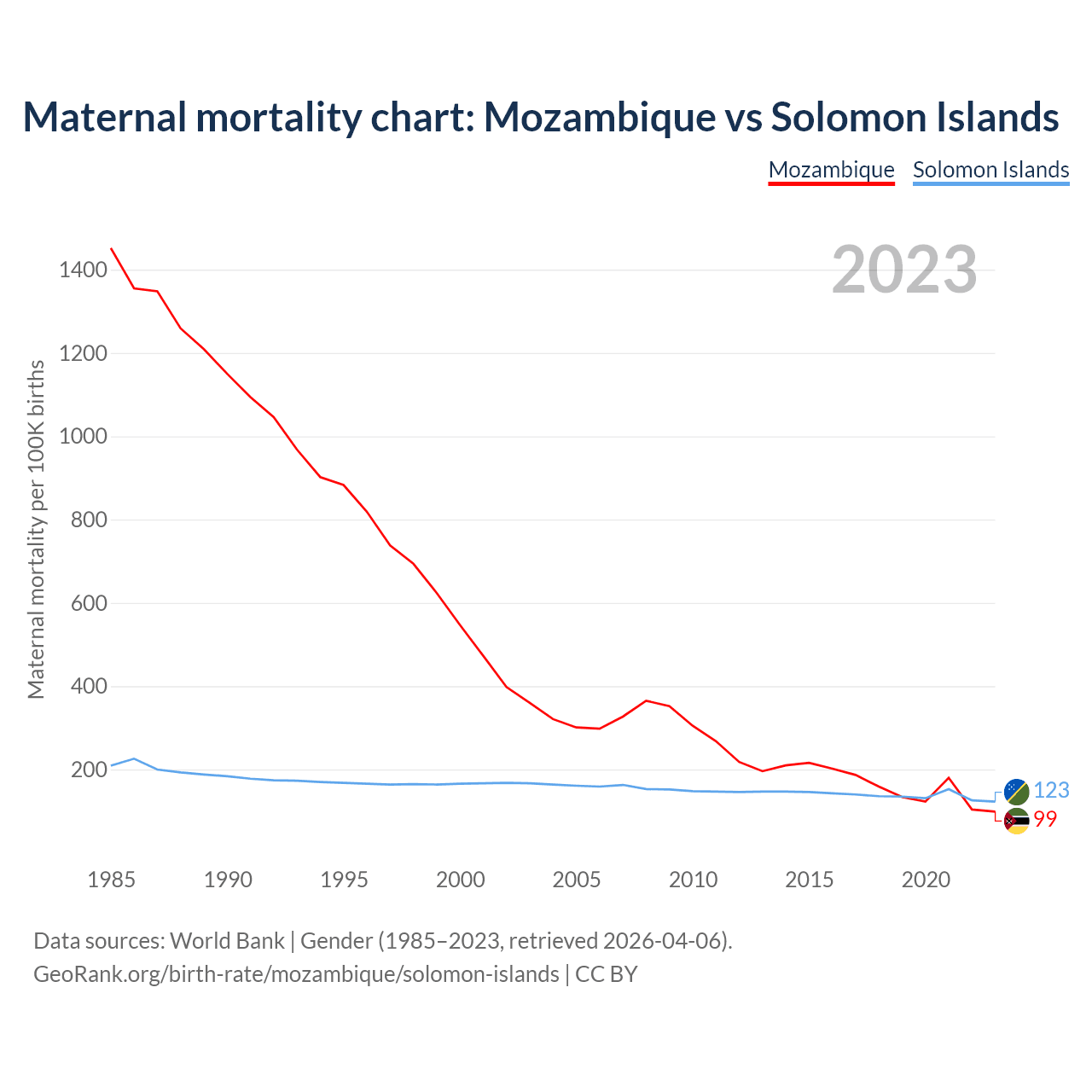 The maternal mortality rate, which is the probability of dying during childbirth or within 42 days of pregnancy termination, is 99 deaths per 100,000 live births in Mozambique, compared to 123 deaths in the Solomon Islands.