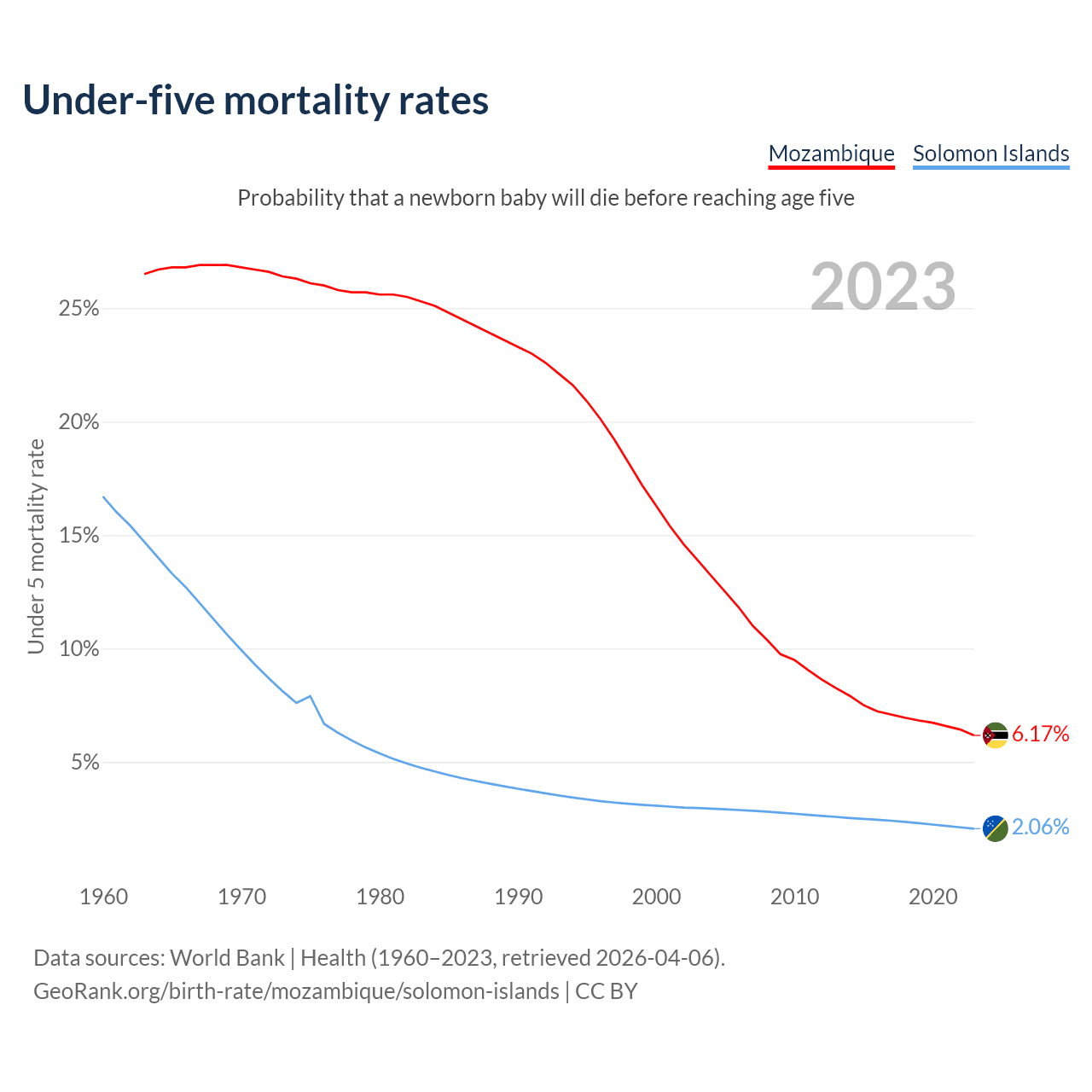 The chance that a newborn baby will die before reaching age five is 6.17% in Mozambique and 2.06% in the Solomon Islands. Above is a chart with historical data on under-five mortality rates.