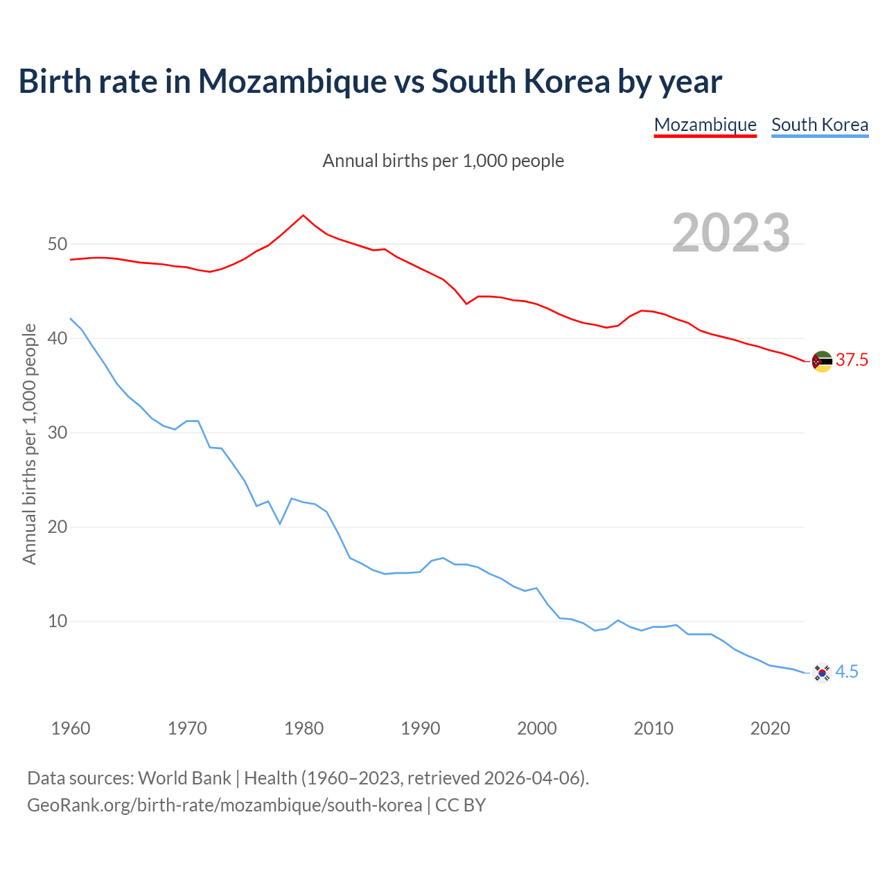 Mozambique has an annual birth rate of 37.5 births per 1,000 people, compared to 4.5 for South Korea. The average number of children a woman is expected to have during her lifetime — the fertility rate, is 4.76 in Mozambique and 0.72 in South Korea — 84.9% difference.