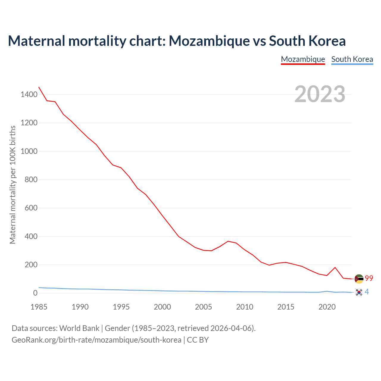 The maternal mortality rate, which is the probability of dying during childbirth or within 42 days of pregnancy termination, is 99 deaths per 100,000 live births in Mozambique, compared to 4 deaths in South Korea.