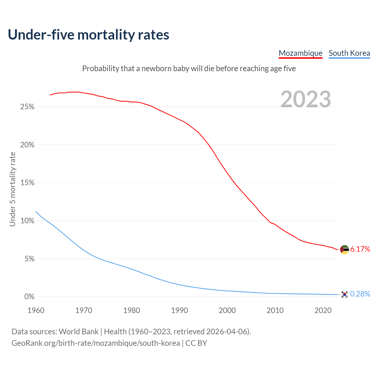 The chance that a newborn baby will die before reaching age five is 6.17% in Mozambique and 0.28% in South Korea. Above is a chart with historical data on under-five mortality rates.