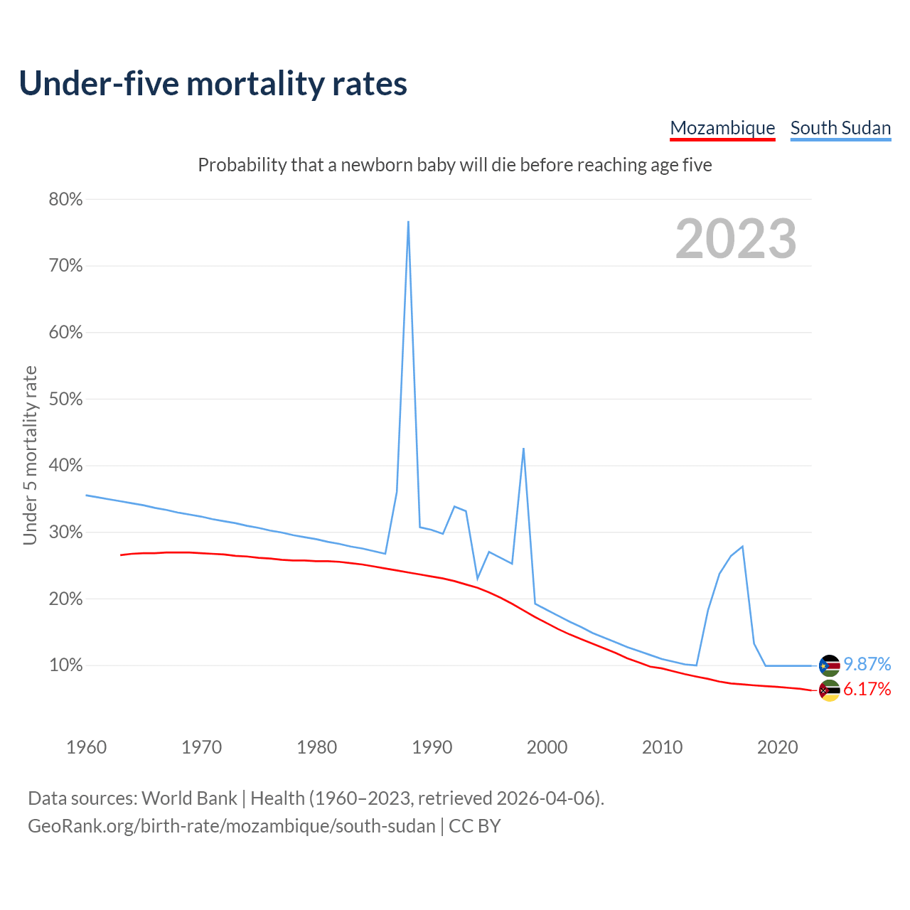 The chance that a newborn baby will die before reaching age five is 6.17% in Mozambique and 9.87% in South Sudan. Above is a chart with historical data on under-five mortality rates.