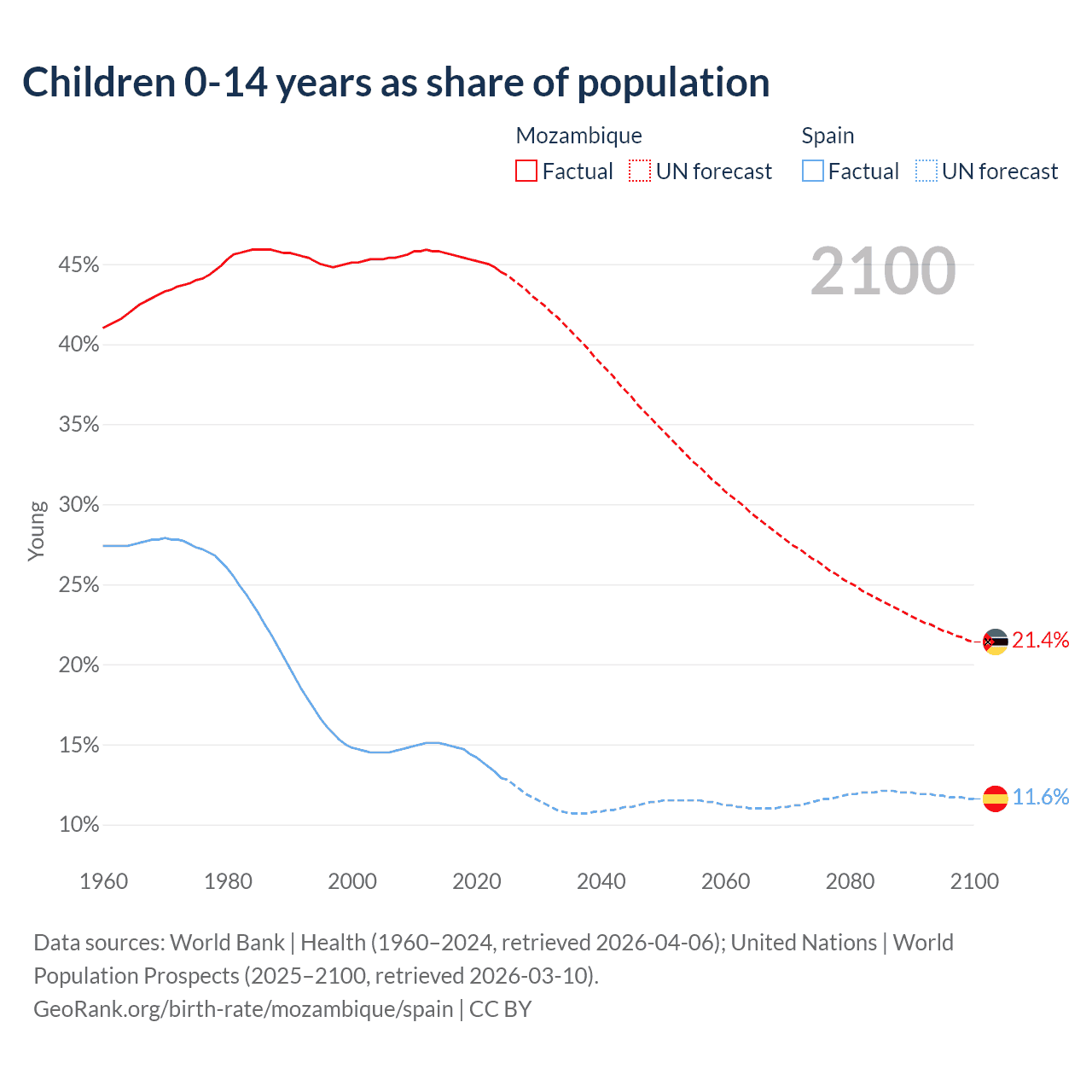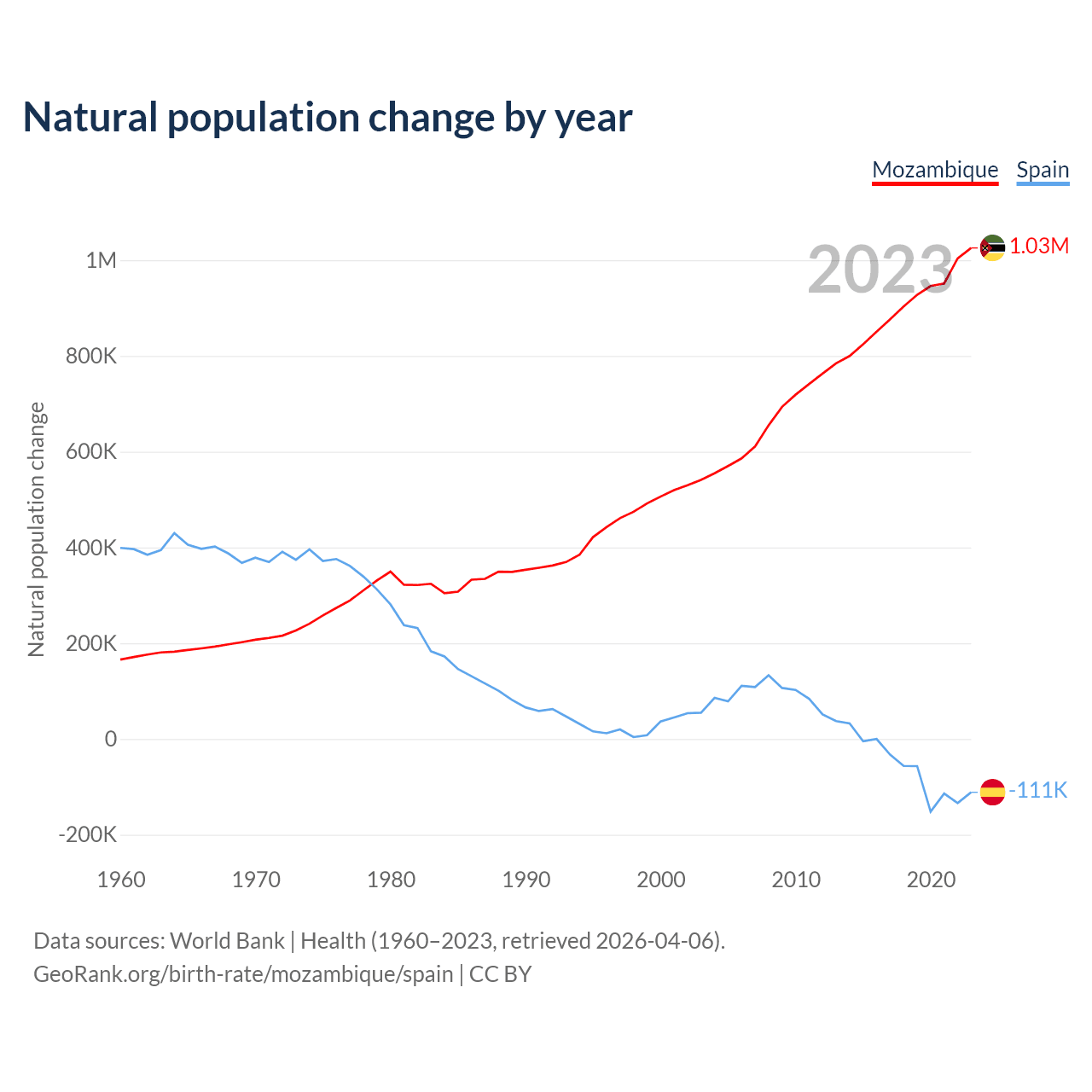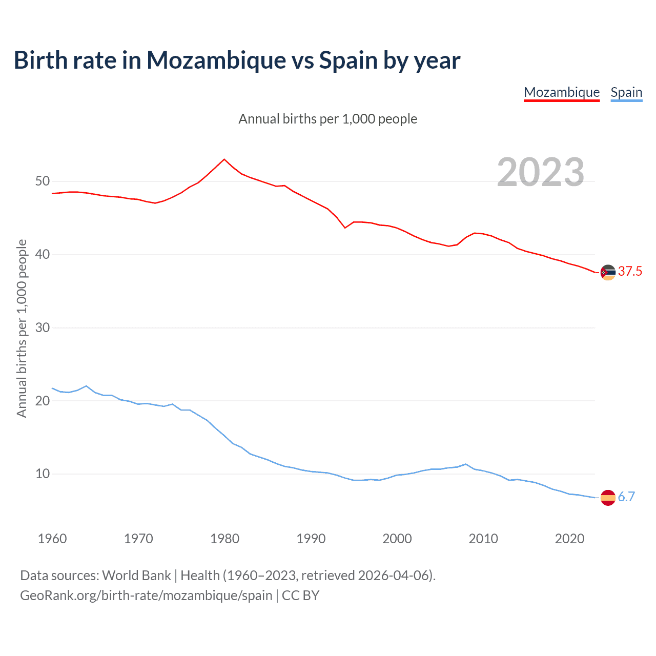 Mozambique has an annual birth rate of 37.5 births per 1,000 people, compared to 6.7 for Spain. The average number of children a woman is expected to have during her lifetime — the fertility rate, is 4.76 in Mozambique and 1.12 in Spain — 76.5% difference.