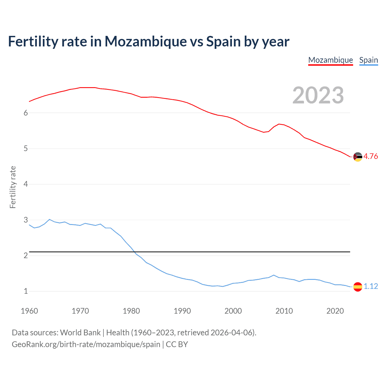 According to the latest available data on birth rates, the fertility rate in Mozambique was 4.76 children per woman in 2023, compared to 1.12 in Spain in 2023. The replacement level is considered to be 2.1 children per woman.