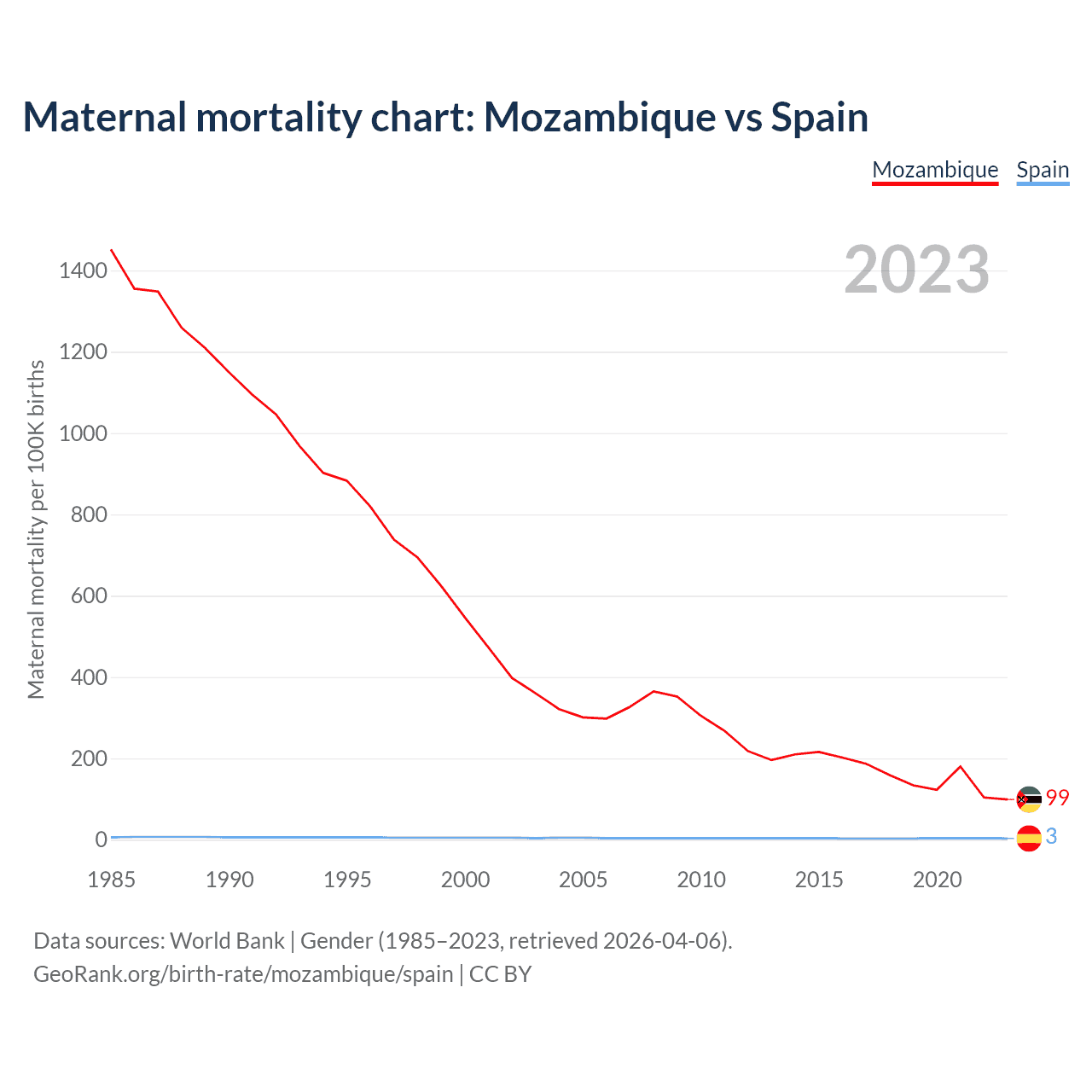 The maternal mortality rate, which is the probability of dying during childbirth or within 42 days of pregnancy termination, is 99 deaths per 100,000 live births in Mozambique, compared to 3 deaths in Spain.