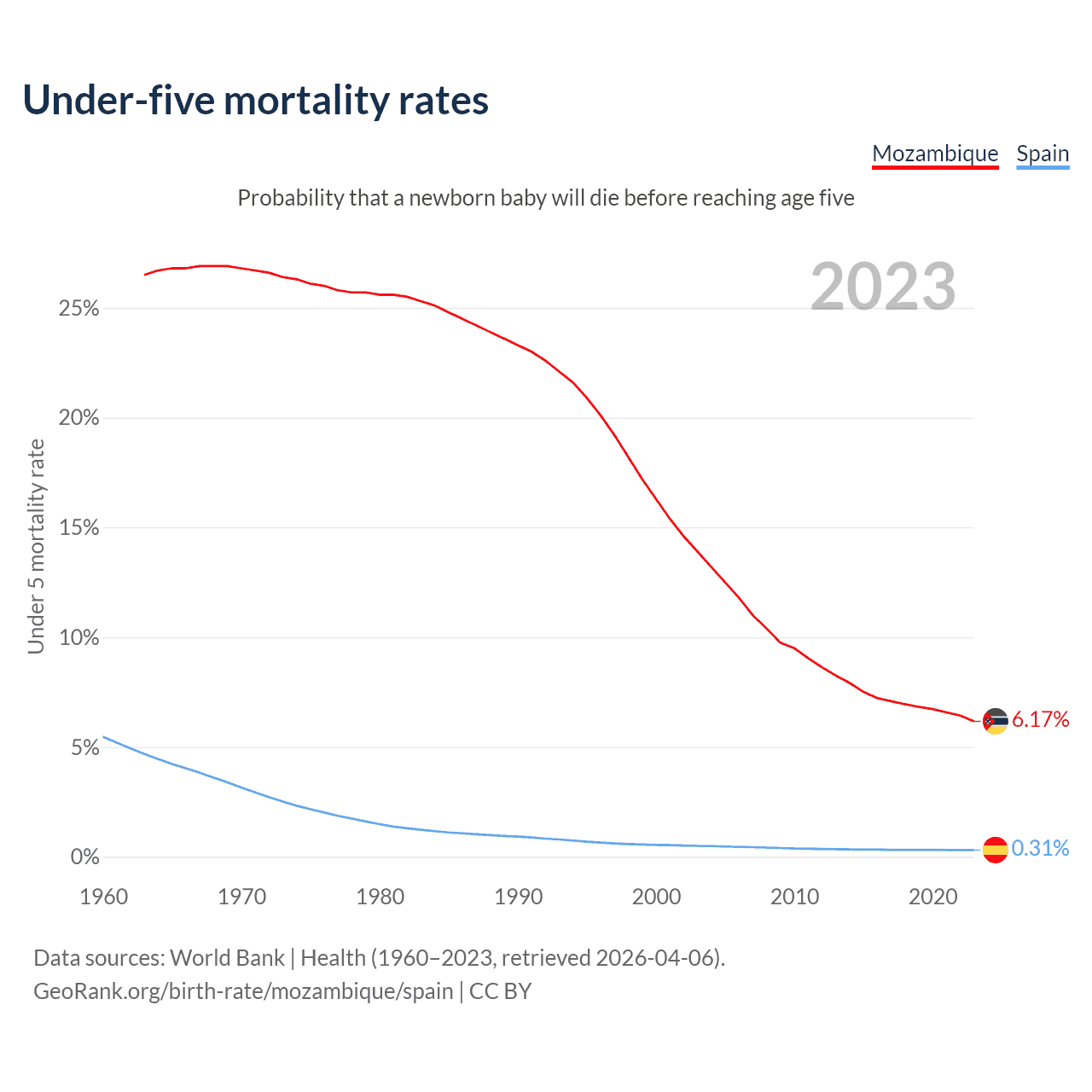The chance that a newborn baby will die before reaching age five is 6.17% in Mozambique and 0.31% in Spain. Above is a chart with historical data on under-five mortality rates.
