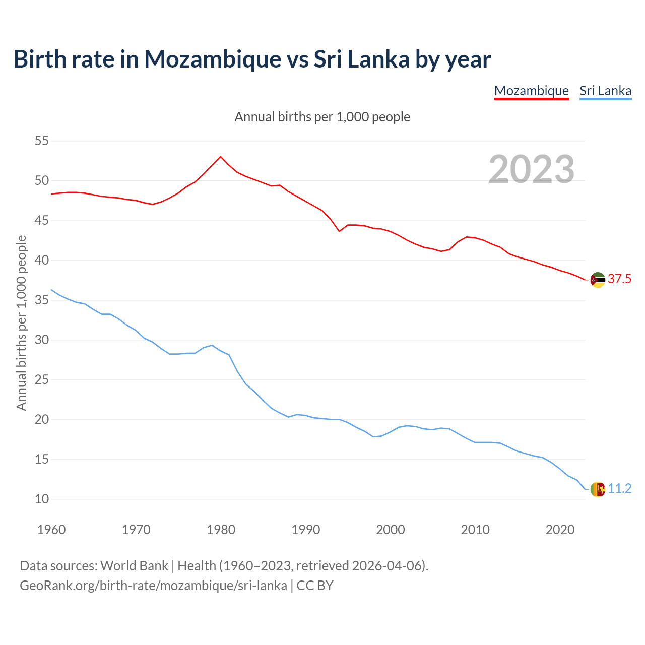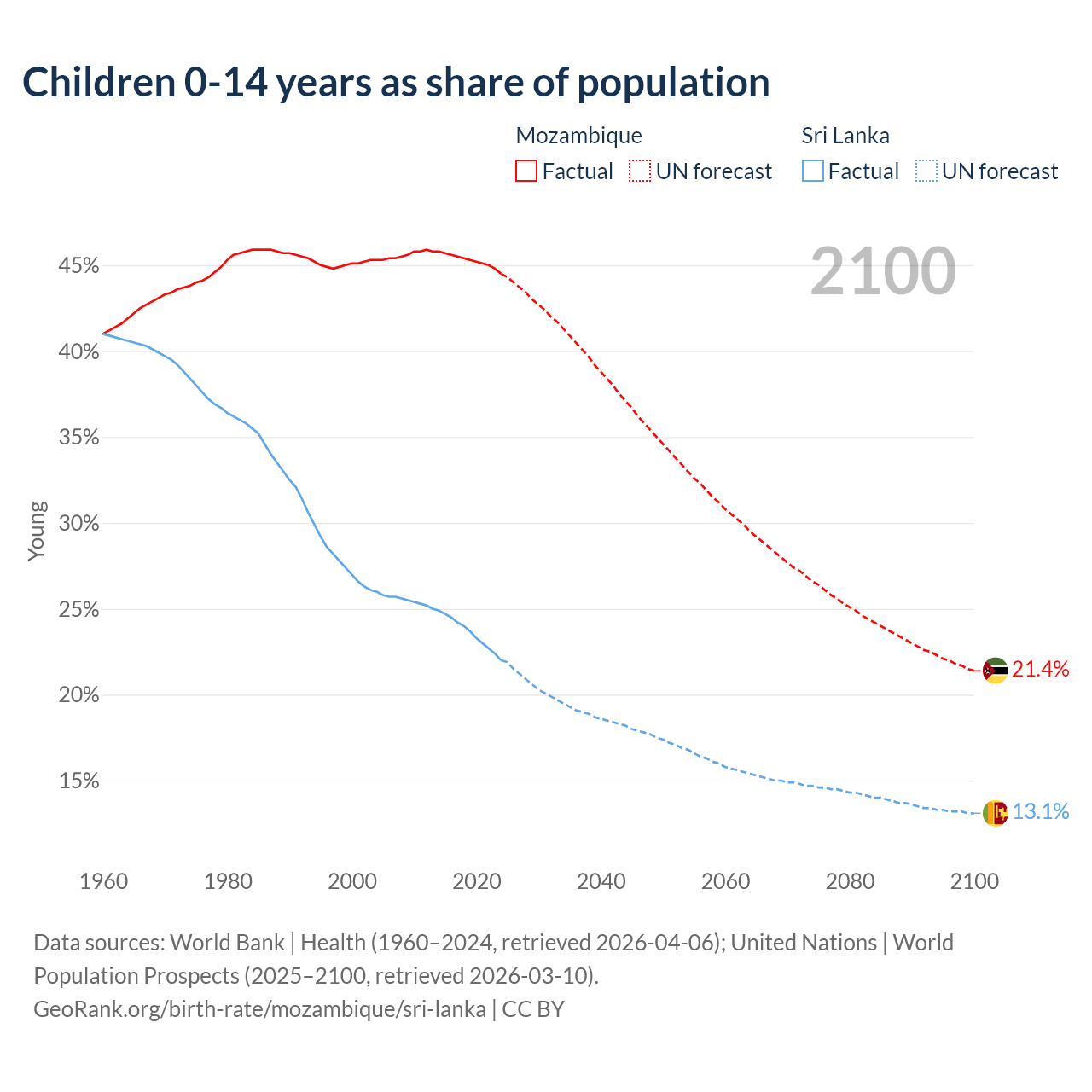 Mozambique has an annual birth rate of 37.5 births per 1,000 people, compared to 11.2 for Sri Lanka. The average number of children a woman is expected to have during her lifetime — the fertility rate, is 4.76 in Mozambique and 1.97 in Sri Lanka — 58.6% difference.