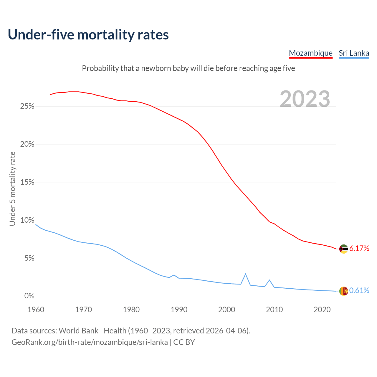 The chance that a newborn baby will die before reaching age five is 6.17% in Mozambique and 0.61% in Sri Lanka. Above is a chart with historical data on under-five mortality rates.