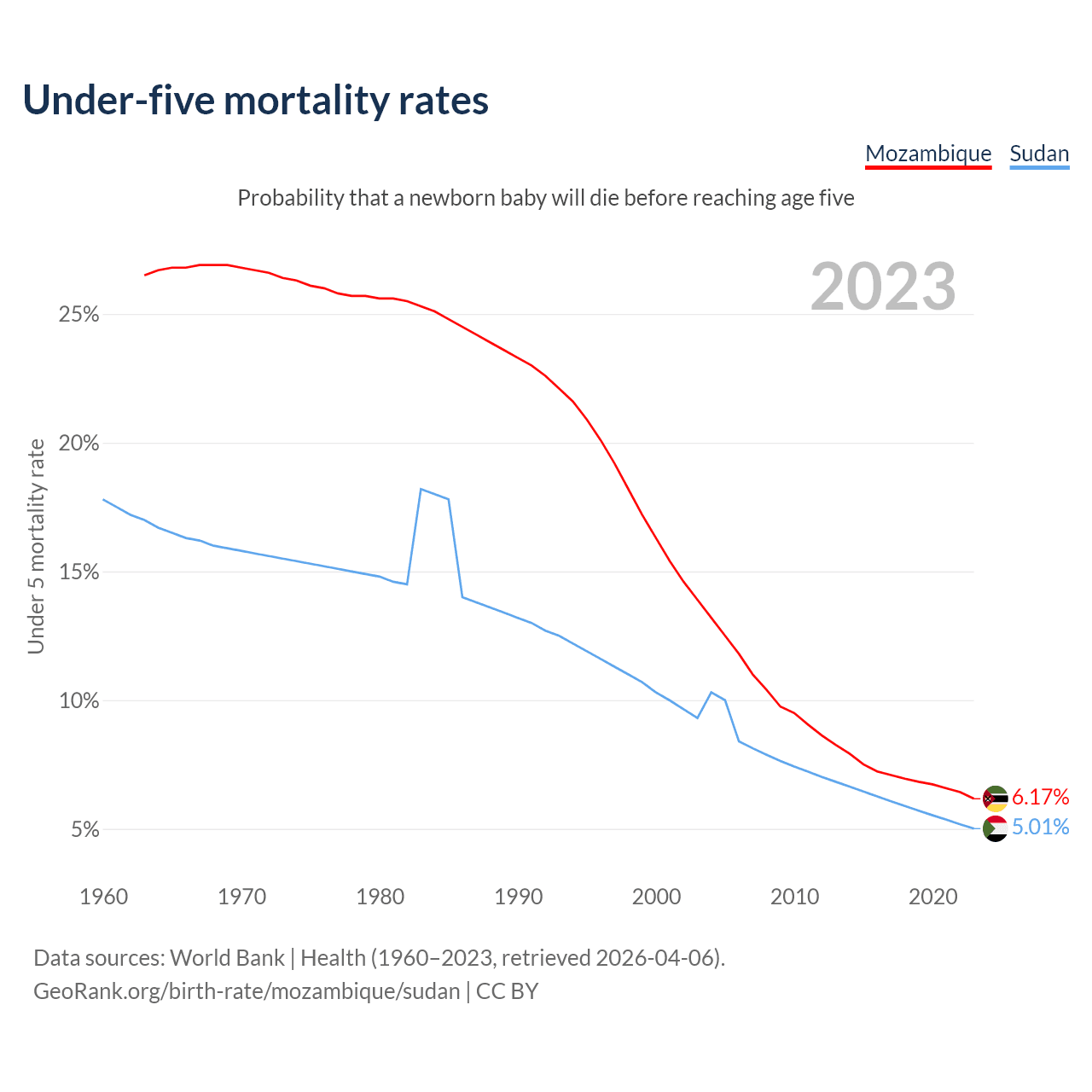The chance that a newborn baby will die before reaching age five is 6.17% in Mozambique and 5.01% in Sudan. Above is a chart with historical data on under-five mortality rates.