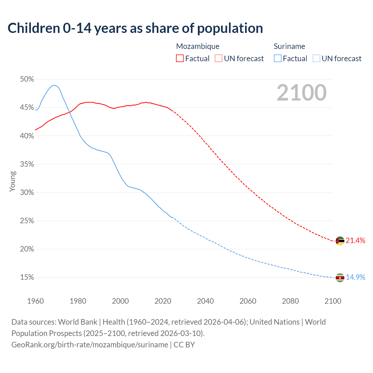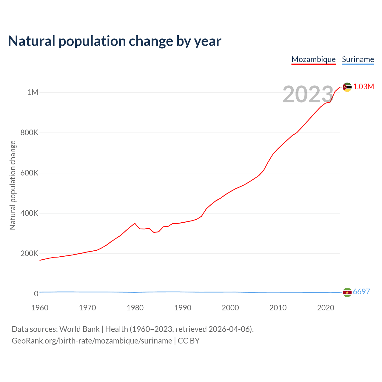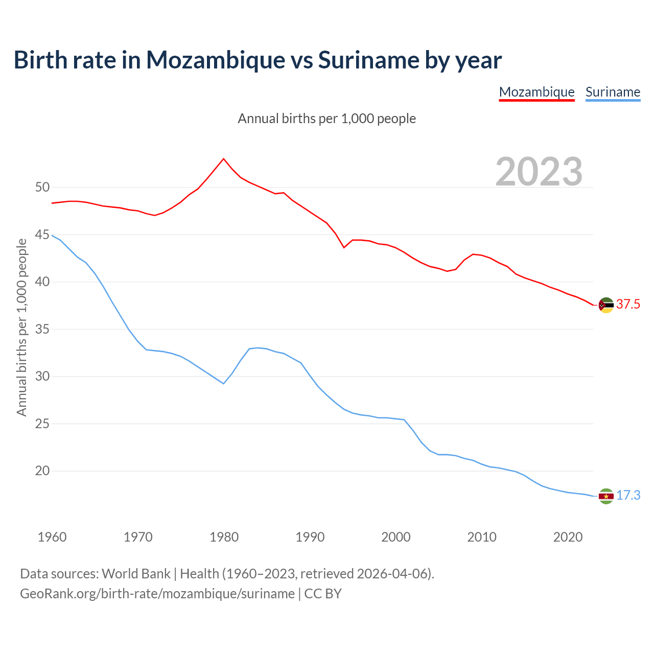 Mozambique has an annual birth rate of 37.5 births per 1,000 people, compared to 17.3 for Suriname. The average number of children a woman is expected to have during her lifetime — the fertility rate, is 4.76 in Mozambique and 2.25 in Suriname — 52.8% difference.