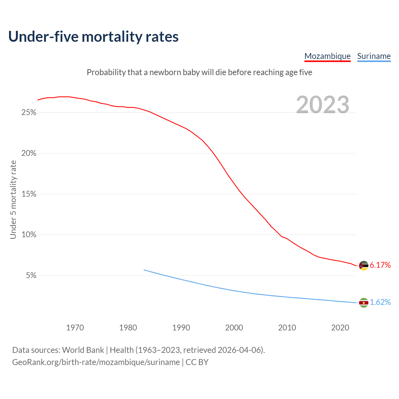 The chance that a newborn baby will die before reaching age five is 6.17% in Mozambique and 1.62% in Suriname. Above is a chart with historical data on under-five mortality rates.