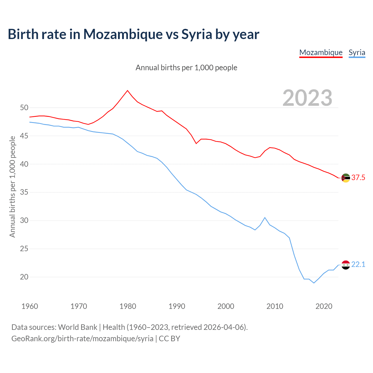 Mozambique has an annual birth rate of 37.5 births per 1,000 people, compared to 22.1 for Syria. The average number of children a woman is expected to have during her lifetime — the fertility rate, is 4.76 in Mozambique and 2.71 in Syria — 43.1% difference.