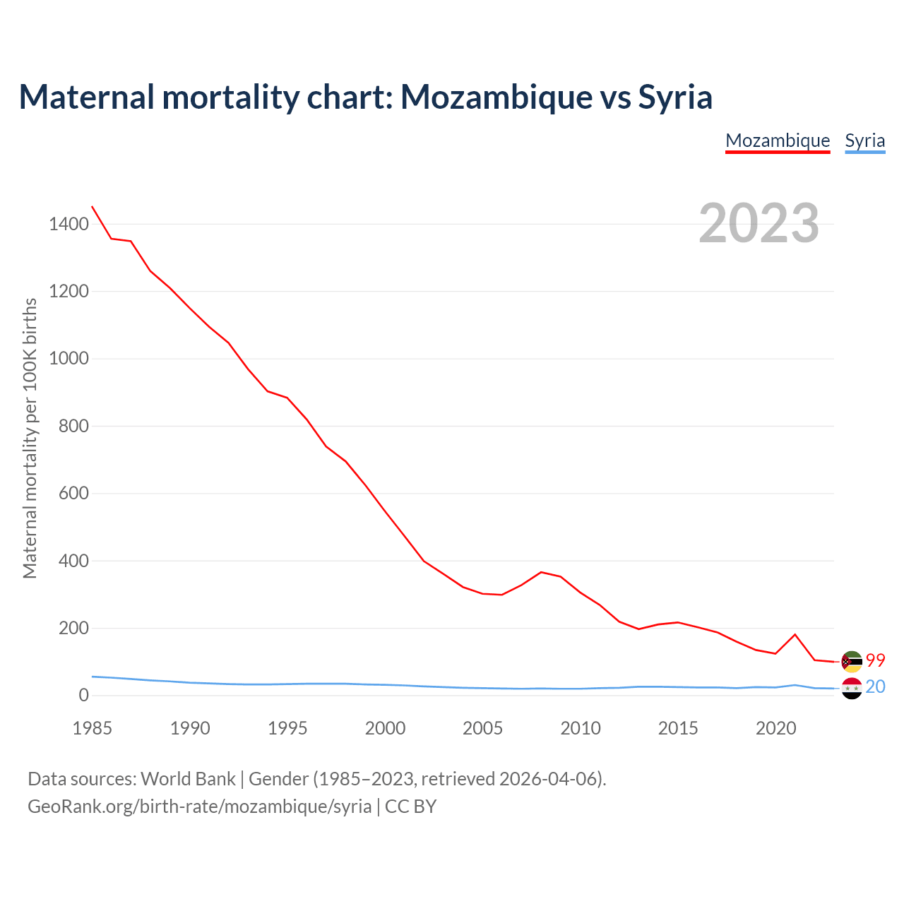 The maternal mortality rate, which is the probability of dying during childbirth or within 42 days of pregnancy termination, is 99 deaths per 100,000 live births in Mozambique, compared to 20 deaths in Syria.