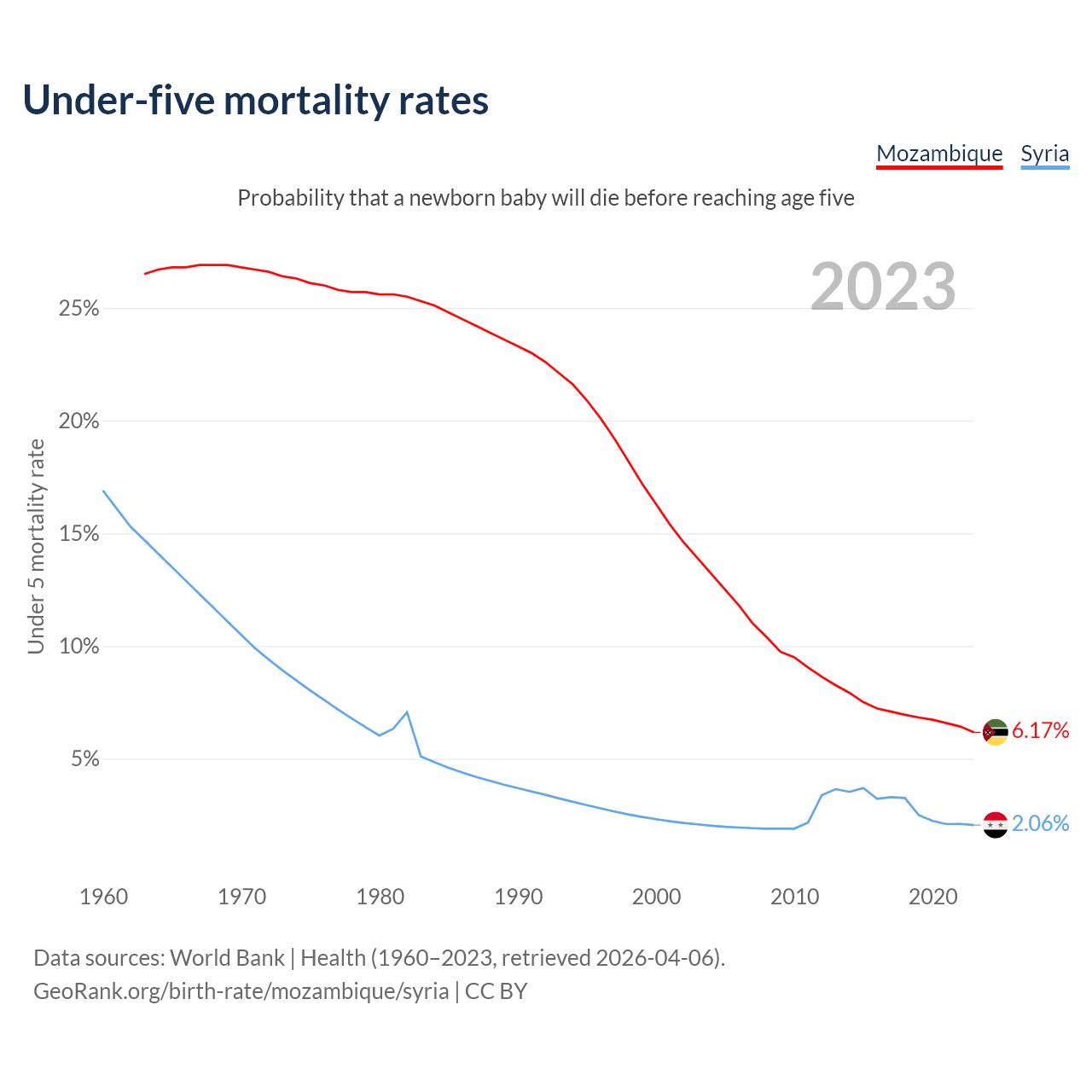 The chance that a newborn baby will die before reaching age five is 6.17% in Mozambique and 2.06% in Syria. Above is a chart with historical data on under-five mortality rates.